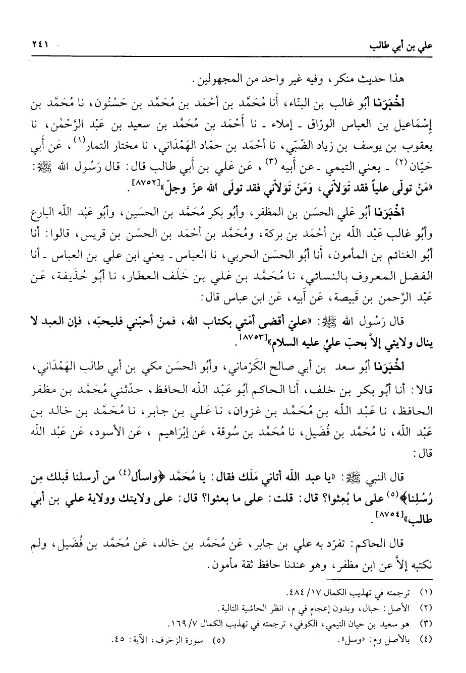 هذا حديث منكر وفيه غير واحد من المجهولين أخبرنا أبو غالب بن البناء أنا محمد بن أحمد بن محمد بن حسنون نا محمد بن إسماعيل بن العباس الوراق إملاء نا أحمد بن محمد بن سعيد بن عبد الرحمن نا يعقوب بن يوسف بن زياد الضبي نا أحمد بن حماد الهمداني نا مختار التمار (1) عن أبي حيان (2) يعني التيمي عن ابيه (3) عن علي بن أبي طالب قال قال رسول الله (صلى الله عليه وسلم) من تولى عليا فقد تولاني ومن تولاني فقد تولى الله عز وجل أخبرنا أبو علي الحسن بن المظفر وأبو بكر محمد بن الحسين وأبو عبد الله البارع وأبو غالب عبد الله بن أحمد بن بركة ومحمد بن أحمد بن الحسن بن قريس قالوا أنا أبو الغنائم بن المأمون أنا أبو الحسن الحربي نا العباس يعني ابن علي بن العباس أنا الفضل المعروف بالنسائي نا محمد بن علي بن خلف العطار نا أبو حذيفة عن عبد الرحمن بن قبيصة عن أبيه عن ابن عباس قال قال رسول الله (صلى الله عليه وسلم) علي أقضى أمتي بكتاب الله فمن أحبني فليحبه فإن العبد لا ينال ولايتي إلا بحب علي عليه السلام أخبرنا أبو سعد بن أبي صالح الكرماني وأبو الحسن مكي بن أبي طالب الهمداني قالا أنا أبو بكر بن خلف أنا الحاكم أبو عبد الله الحافظ حدثني محمد بن مظفر الحافظ نا عبد الله بن محمد بن غزوان نا علي بن جابر نا محمد بن خالد بن عبد الله نا محمد بن فضيل نا محمد بن سوقة عن إبراهيم عن الأسود عن عبد الله قال قال النبي (صلى الله عليه وسلم) يا عبد الله أتاني ملك فقال يا محمد (4) " واسأل من أرسلنا قبلك من رسلنا (5) " على ما بعثوا قال قلت على ما بعثوا قال على ولايتك وولاية علي بن أبي طالب قال الحاكم تفرد به علي بن جابر عن محمد بن خالد عن محمد بن فضيل ولم نكتبه إلا عن ابن مظفر وهو عندنا حافظ ثقة مأمون