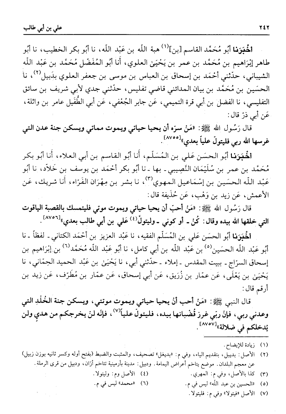 أخبرنا أبو محمد القاسم بن (1) هبة الله بن عبد الله نا أبو بكر الخطيب نا أبو طاهر إبراهيم بن محمد بن عمر بن يحيى العلوي أنا أبو المفضل محمد بن عبد الله الشيباني حدثني أحمد بن إسحاق بن العباس بن موسى بن جعفر العلوي بدبيل (2) نا الحسين بن محمد بن بيان المدائني قاضي تفليس حدثني جدي لأبي شريف بن سائق التفليسي نا الفضل بن أبي قرة التميمي عن جابر الجعفي عن أبي الطفيل عامر بن واثلة عن أبي ذر قال قال رسول الله (صلى الله عليه وسلم) من سره أن يحيا حياتي ويموت مماتي ويسكن جنة عدن التي غرسها الله ربي فليتول عليا بعدي أخبرنا أبو الحسن علي بن المسلم أنا أبو القاسم بن أبي العلاء أنا أبو بكر محمد بن عمر بن سليمان النصيبي بها نا أبو بكر أحمد بن يوسف بن خلاد نا أبو عبد الله الحسين بن إسماعيل المهوي (3) نا بشر بن مهران الفراء أنا شريك عن الأعمش عن زيد بن وهب عن حذيفة قال قال رسول الله (صلى الله عليه وسلم) من أحب أن يحيا حياتي ويموت موتي فليتمسك بالقصبة الياقوت التي خلقها الله بيده وقال كن أو كوني وليتول (4) علي بن أبي طالب بعدي أخبرنا أبو الحسن علي بن المسلم الفقيه نا عبد العزيز بن أحمد الكتاني لفظا نا أبو عبد الله الحسين (5) بن عبد الله بن أبي كامل نا أبو عبد الله محمد (6) بن إبراهيم بن إسحاق السراج ببيت المقدس إملاء حدثني أبي نا يحيى بن عبد الحميد الحماني نا يحيى بن يعلى عن عمار بن زريق عن أبي إسحاق عن عمار بن مطرف عن زيد بن أرقم قال قال النبي (صلى الله عليه وسلم) من أحب أن يحيا حياتي ويموت موتتي ويسكن جنة الخلد التي وعدني ربي فإن ربي غرز قضبانها بيده فليتول عليا (7) فإنه لن يخرجكم من هدي ولن يدخلكم في ضلالة