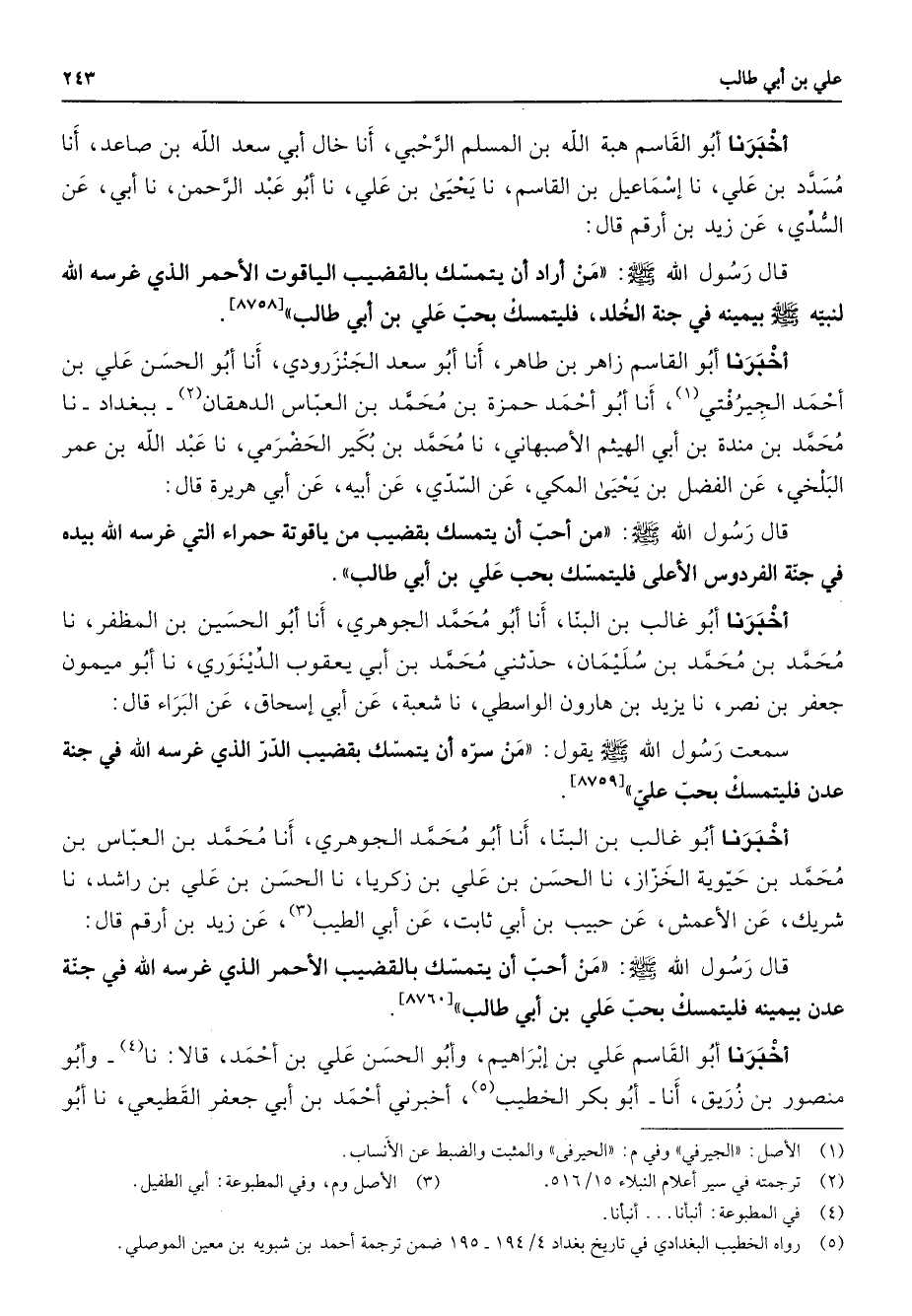 أخبرنا أبو القاسم هبة الله بن المسلم الرحبي أنا خال أبي سعد الله بن صاعد أنا مسدد بن علي نا إسماعيل بن القاسم نا يحيى بن علي نا أبو عبد الرحمن نا أبي عن السدي عن زيد بن أرقم قال قال رسول الله (صلى الله عليه وسلم) من أراد أن يتمسك بالقضيب الياقوت الأحمر الذي غرسه الله لنبيه (صلى الله عليه وسلم) بيمينه في جنة الخلد فليتمسك بحب علي بن أبي طالب أخبرنا أبو القاسم زاهر بن طاهر أنا أبو سعد الجنزرودي أنا أبو الحسن علي بن أحمد الجيرفتي (1) أنا أبو أحمد حمزة بن محمد بن العباس الدهقان (2) ببغداد نا محمد بن مندة بن أبي الهيثم الأصبهاني نا محمد بن بكير الحضرمي نا عبد الله بن عمر البلخي عن الفضل بن يحيى المكى عن السدي عن أبيه عن أبي هريرة قال قال رسول الله (صلى الله عليه وسلم) من أحب أن يتمسك بقضيب من ياقوتة حمراء التي غرسه الله بيده في جنة الفردوس الأعلى فليتمسك بحب علي بن أبي طالب أخبرنا أبو غالب بن البنا أنا أبو محمد الجوهري أنا أبو الحسين بن المظفر نا محمد بن محمد بن سليمان حدثني محمد بن أبي يعقوب الدينوري نا أبو ميمون جعفر بن نصر نا يزيد بن هارون الواسطي نا شعبة عن أبي إسحاق عن البراء قال سمعت رسول الله (صلى الله عليه وسلم) يقول من سره أن يتمسك بقضيب الدر الذي غرسه الله في جنة عدن فليتمسك بحب علي أخبرنا أبو غالب بن البنا أن أبو محمد الجوهري أنا محمد بن العباس بن محمد بن حيوية الخزاز نا الحسن بن علي بن زكريا نا الحسن بن علي بن راشد نا شريك عن الأعمش عن حبيب بن أبي ثابت عن أبي الطيب (3) عن زيد بن إرقم قال قال رسول الله (صلى الله عليه وسلم) من أحب أن يتمسك بالقضيب الأحمر الذي غرسه الله في جنة عدن بيمينه فليتمسك بحب علي بن أبي طالب أخبرنا أبو القاسم علي بن إبراهيم وأبو الحسن علي بن أحمد قالا نا (4) وأبو منصور بن زريق أنا أبو بكر الخطيب (5) أخبرني أحمد بن أبي جعفر القطيعي نا أبو
