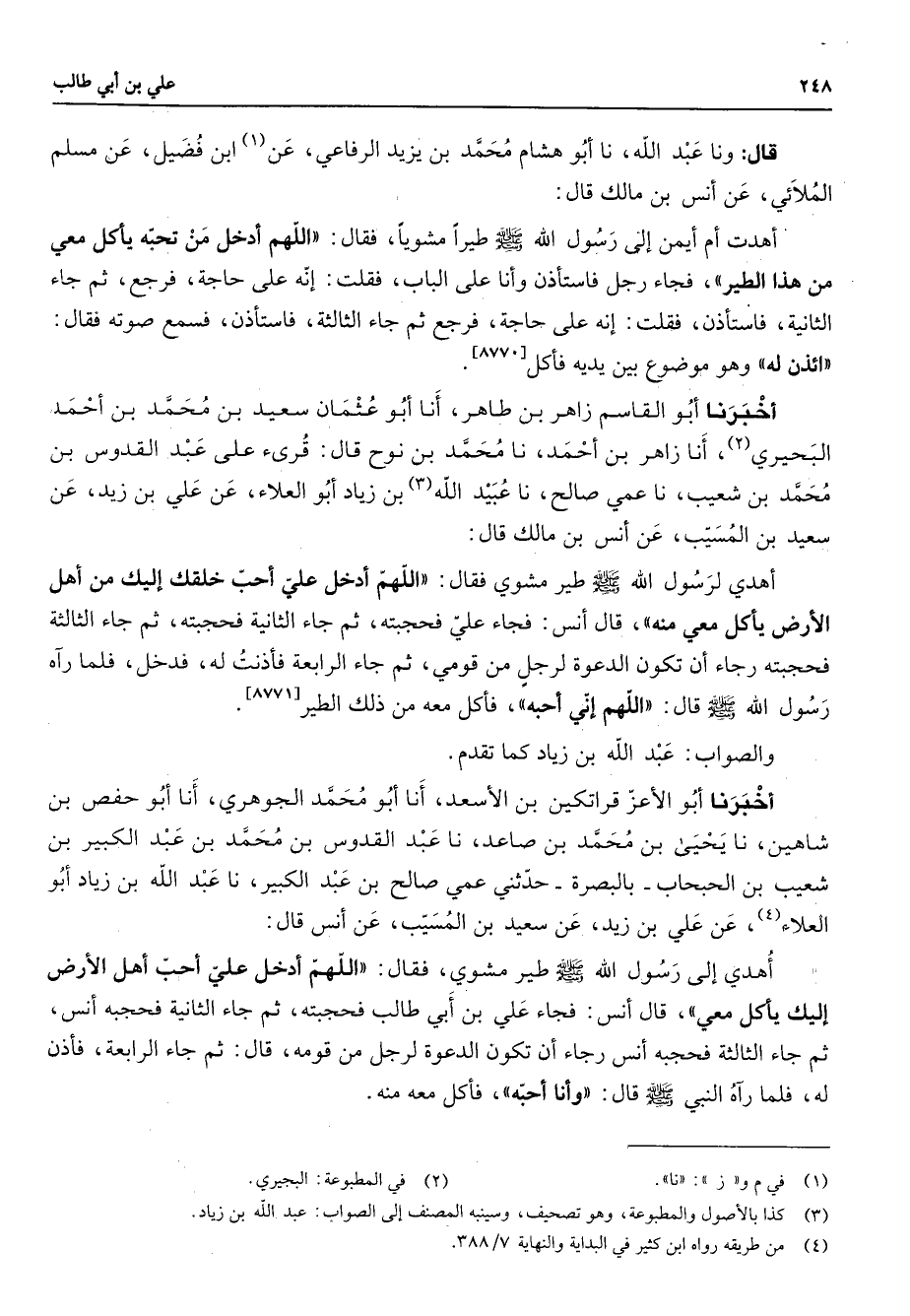 قال وناعبد الله نا أبو هشام محمد بن يزيد الرفاعي عن ابن فضيل عن (1) مسلم الملائي عن أنس بن مالك قال أهدت أم أيمن إلى رسول الله (صلى الله عليه وسلم) طيرا مشويا فقال اللهم أدخل من تحبه يأكل معي من هذا الطير فجاء رجل فاستأذن وأنا على الباب فقلت إنه على حاجة فرجع ثم جاء الثانية فاستأذن فقلت إنه على حاجة فرجع ثم جاء الثالثة فاستأذن فسمع صوته فقال أئذن له وهو موضوع بين يديه فأكل أخبرنا أبو القاسم زاهر بن طاهر أنا أبو عثمان سعيد بن محمد بن أحمد البحيري (2) أنا زاهر بن أحمد نا محمد بن نوح قال قرئ على عبد القدوس بن محمد بن شعيب نا عمي صالح نا عبيد الله (3) بن زياد أبو العلاء عن علي بن زيد عن سعيد بن المسيب عن أنس بن مالك قال أهدي لرسول الله (صلى الله عليه وسلم) طير مشوي فقال اللهم أدخل علي أحب خلقك إليك من أهل الأرض يأكل ممعي منه قال أنس فجاء علي فحجبته ثم جاء الثانية فحجبته ثم جاء الثالثة فحجبته رجاء أن تكون الدعوة لرجل من قومي ثم جاء الرابعة فأذنت له فدخل فلما راه رسول الله (صلى الله عليه وسلم) قال اللهم إني أحبه فأكل معه من ذلك الطير والصواب عبد الله بن زياد كما تقدم أخبرنا أبو الأعز قراتكين بن الأسعد أنا أبو محمد الجوهري أنا أبو حفص بن شاهين نا يحيى بن محمد بن صاعد نا عبد القدوس بن محمد بن عبد الكبير بن شعيب بن الحبحاب بالبصرة حدثني عمي صالح بن عبد الكبير نا عبد الله بن زياد أبو العلاء (4) عن علي بن زيد عن سعيد بن المسيب عن أنس قال أهدي إلى رسول الله (صلى الله عليه وسلم) طير مشوي فقال اللهم أدخل علي أحب أهل الأرض إليك يأكل معي قال أنس فجاء علي بن أبي طالب فحجبته ثم جاء الثانية فحجبه أنس ثم جاء الثالثة فحجبه أنس رجاء ان تكون الدعوة لرجل من قومه قال ثم جاء الرابعة فأذن له فلما راه النبي (صلى الله عليه وسلم) قال وأنا أحبه فأكل معه منه