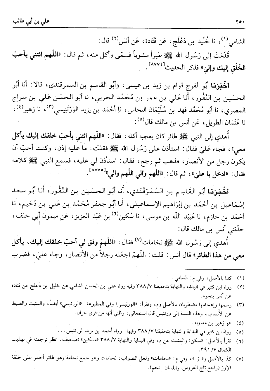 الشامي (1) نا خليد بن دعلج عن قتادة عن أنس (2) قال قدمت إلى رسول الله صلى الله عليه وس) طيرا مشويا فسمى وأكل منه ثم قال أللهم أئتني بأحب الخلق إليك وإلي فذكر الحديث أخبرنا أبو الفرج قوام بن زيد بن عيسى وأبو القاسم بن السمرقندي قالا أنا أبو الحسين بن النقور أنا علي بن عمر بن محمد الحربي نا أبو الحسن علي بن سراج المصري نا أبو محمد فهد بن سليمان النحاس نا أحمد بن يزيد الورتنيسي (3) نا زهير (4) نا عثمان الطويل عن أنس بن مالك قال (5) أهدي إلى النبي (صلى الله عليه وسلم) طائر كان يعجبه أكله فقال اللهم أئتني بأحب خلقك إليك يأكل معي فجاء علي فقال استأذن على رسول الله (صلى الله عليه وسلم) فقلت ما عليه إذن وكنت أحب أن يكون رجل من الأنصار فذهب ثم رجع فقال استأذن لي عليه فسمع النبي (صلى الله عليه وسلم) كلامه فقال ادخل يا علي ثم قال اللهم والي اللهم والي أخبرنا أبو القاسم بن السمرقندي أنا أبو الحسين بن النقور أنا أبو سعد إسماعيل بن أحمد بن إبراهيم الإسماعيلي أنا أبو جعفر محمد بن علي بن دحيم نا أحمد بن حازم نا عبيد الله بن موسى نا سكين (6) بن عبد العزيز عن ميمون أبي خلف حدثني أنس بن مالك قال أهدي إلى رسول الله (صلى الله عليه وسلم) نخامات (7) فقال اللهم وفق لي أحب خلقك إليك يأكل معي من هذا الطائر قال أنس قلت أللهم أجعله رجلا من الأنصار وجاء علي فضرب