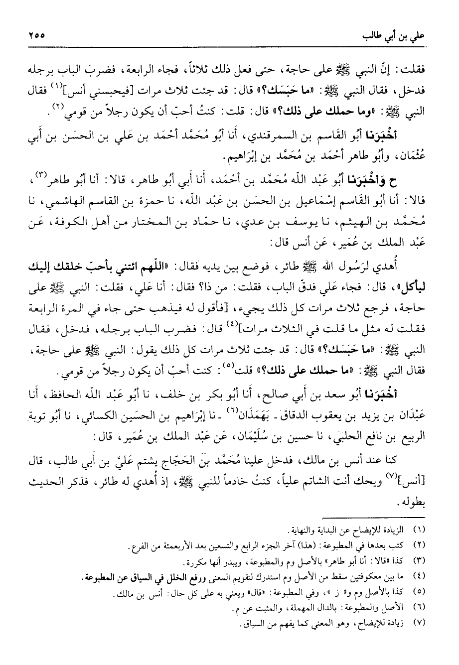 فقلت إن النبي (صلى الله عليه وسلم) على حاجة حتى فعل ذلك ثلاثا فجاء الرابعة فضرب الباب برجله فدخل فقال النبي (صلى الله عليه وسلم) ما حبسك قال قد جئت ثلاث مرات فيحبسني (1) أنس فقال النبي (صلى الله عليه وسلم) وما حملك على ذلك قال قلت كنت أحب أن يكون رجلا من قومي [* * * (2) أخبرنا أبو القاسم بن المسرقندي أنا أبو محمد أحمد بن علي بن الحسن بن أبي عثمان وأبو طاهر أحمد بن محمد بن إبراهيم ح وأخبرنا أبو عبد الله محمد بن أحمد أنا أبي أبو طاهر قالا أنا أبو طاهر (3) قالا أنا أبو القاسم إسماعيل بن الحسن بن عبد الله نا حمزة بن القاسم الهاشمي نا محمد بن الهيثم نا يوسف بن عدي نا حماد بن المختار من أهل الكوفة عن عبد الملك بن عمير عن أنس قال أهدي لرسول الله (صلى الله عليه وسلم) طائر فوضع بين يديه فقال اللهم ائتني بأحب خلقك إليك ليأكل قال فجاء علي فدق الباب فقلت من ذا فقال أنا علي فقلت النبي (صلى الله عليه وسلم) على حاجة فرجع ثلاث مرات كل ذلك يجئ فأقول له فيذهب حتى جاء في المرة الرابعة فقلت له مثل ما قلت في الثلاث مرات (4) قال فضرب الباب برجله فدخل فقال النبي (صلى الله عليه وسلم) ما حبسك قال قد جئت ثلاث مرات كل ذلك يقول النبي (صلى الله عليه وسلم) على حاجة فقال النبي (صلى الله عليه وسلم) ما حملك على ذلك قلت (5) كنت أحب أن يكون رجلا من قومي أخبرنا أبو سعد بن أبي صالح أنا أبو بكر بن خلف نا أبو عبد الله الحافظ أنا عبدان بن يزيد بن يعقوب الدقاق بهمذان (6) نا إبراهيم بن الحسين الكسائي نا أبو توبة الربيع بن نافع الحلبي نا حسين بن سليمان عن عبد الملك بن عمير قال كنا عند أنس بن مالك فدخل علينا محمد بن الحجاج يشتم علي بن أبي طالب قال أنس (7) ويحك أنت الشاتم عليا كنت خادما للنبي (صلى الله عليه وسلم) إذ أهدي له طائر فذكر الحديث بطوله