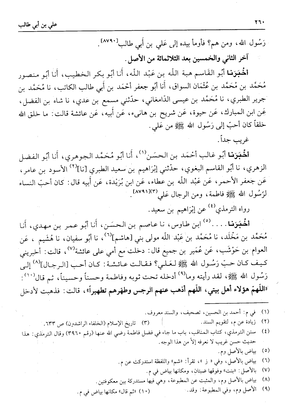 رسول الله ومن هم فأومأ بيده إلى علي بن أبي طالب اخر الثاني والخمسين بعد الثلاثمائة من الأصل أخبرنا أبو القاسم هبة الله بن عبد الله أنا أبو بكر الخطيب أنا أبو منصور محمد بن محمد بن عثمان السواق أنا أبو جعفر أحمد بن أبي طالب الكاتب نا محمد بن جرير الطبري نا محمد بن عيسى الدامغاني حدثني مسمع بن عدي نا شاه بن الفضل عن ابن المبارك عن حيوة عن شريح بن هانئ عن أبيه عن عائشة قالت ما خلق الله خلقا كان أحب إلى رسول الله (صلى الله عليه وسلم) من علي غريب جدا أخبرنا أبو غالب أحمد بن الحسن (1) أنا أبو محمد الجوهري أنا أبو الفضل الزهري نا أبو القاسم البغوي حدثني إبراهيم بن سعيد الطبري نا (2) الأسود بن عامر عن جعفر الأحمر عن عبد الله بن عطاء عن ابن بريدة عن أبيه قال كان أحب النساء لرسول الله (صلى الله عليه وسلم) فاطمة ومن الرجال علي (3) رواه الترمذي (4) عن إبراهيم بن سعيد أخبرنا (5) ابن طاوس نا عاصم بن الحسن أنا أبو عمر بن مهدي أنا محمد بن مخلد نا محمد بن عبد الله مولى بني هاشم (6) نا أبو سفيان نا هشيم عن العوام بن حوشب عن عمير بن جميع قال دخلت مع أمي على عائشة (7) قالت أخبريني كيف كان حب رسول الله (صلى الله عليه وسلم) لعلي فقالت عائشة كان أحب الرجال (8) إلى رسول الله (صلى الله عليه وسلم) لقد رأيته وما (9) أدخله تحت ثوبه وفاطمة وحسنا وحسينا ثم قال (10) اللهم هؤلاء أهل بيتي اللهم أذهب عنهم الرجس وطهرهم تطهيرا قالت فذهبت لأدخل