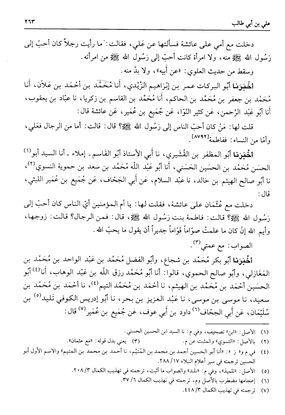 دخلت مع امي على عائشة فسألتها عن علي فقالت ما رأيت رجلا كان أحب إلى رسول الله (صلى الله عليه وسلم) منه ولا امرأة أحب إلى رسول الله (صلى الله عليه وسلم) من امرأته وسقط من حديث العلوي عن أبيه ولا بد منه أخبرنا أبو البركات عمر بن إبراهيم الزيدي أنا محمد بن أحمد بن علان أنا محمد بن جعفر بن محمد بن الحاكم أنا محمد بن القاسم بن زكريا نا عباد بن يعقوب أنا أبو عبد الرحمن عن كثير النوا عن جميع بن عمير عن عائشة قال قلت لها من كان أحب الناس إلى رسول الله (صلى الله عليه وسلم) قال قالت أما من الرجال فعلي وأما من النساء ففاطمة أخبرنا أبو المظفر بن القشيري نا أبي الأستاذ أبو القاسم إملاء أنا السيد أبو (1) الحسن محمد بن الحسين الحسني أنا أبو عبد الله محمد بن سعد حموية النسوي (2) نا أبو صالح الهيثم بن خالد نا عبد السلام عن أبي الجحاف عن جميع بن عمير الليثي قال دخلت مع عثمان على عائشة فقلت لها يا أم المؤمنين أي الناس كان أحب إلى رسول الله (صلى الله عليه وسلم) قالت فاطمة بنت رسول الله (صلى الله عليه وسلم) قال فمن الرجال قالت زوجها وأيم الله إن كان ما علمت صواما قواما جديرا أن يقول ما يحب الله الصواب مع عمتي (3) أخبرنا أبو بكر محمد بن شجاع وأبو الفضل محمد بن عبد الواحد بن محمد بن المغازلي وأبو صالح الحموي قالوا أنا أبو محمد رزق الله بن عبد الوهاب أنا (4) أبو الحسين أحمد بن محمد بن الهيثم نا أحمد بن محمد التيم نا أحمد بن محمد بن سعيد نا موسى بن موسى نا عبد العزيز بن بحر نا أبو إدريس الكوفي تليد بن سليمان عن أبي الجحاف (6) داود بن أبي عوف عن جميع بن عمير (7) قال دخلت مع عمتي على عائشة فقالت يا أم المؤمنين أي الناس كان أحب إلى