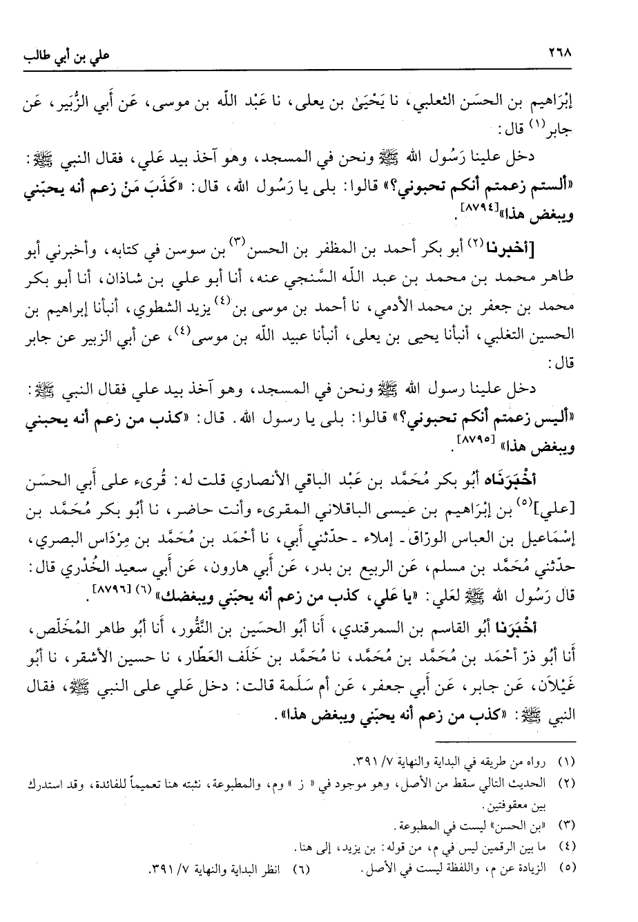 إبراهيم بن الحسن الثعلبي نا يحيى بن يعلى نا عبد الله بن موسى عن أبي الزبير عن جابر (1) قال دخل علينا رسول الله (صلى الله عليه وسلم) ونحن في المسجد وهو اخذ بيد علي فقال النبي (صلى الله عليه وسلم) ألستم زعمتم أنكم تحبوني قالوا بلى يا رسول الله قال كذب من زعم أنه يحبني ويبغض هذا أخبرنا (2) أبو بكر أحمد بن المظفر بن الحسن (3) بن سوسن في كتابه واخبرني أبو طاهر محمد بن محمد بن عبد الله السنجي عنه أنا أبو علي بن شاذان أنا أبو بكر محمد بن جعفر بن محمد الأدمي نا أحمد بن موسى بن (4) يزيد الشطوي أنبأنا إبراهيم بن الحسين التغلبي أنبأنا يحيى بن يعلى أنبأنا عبيد الله بن موسى (4) عن أبي الزبير عن جابر قال دخل علينا رسول الله (صلى الله عليه وسلم) ونحن في المسجد وهو اخذ بيد علي فقال النبي (صلى الله عليه وسلم) أليس زعمتم أنكم تحبوني قالوا بلى يا رسول الله قال كذب من زعم أنه يحبني ويبغض هذا أخبرناه أبو بكر محمد بن عبد الباقي الأنصاري قلت له قرئ على أبي الحسن علي (5) بن إبراهيم بن عيسى الباقلاني المقرئ وانت حاضر نا أبو بكر محمد بن إسماعيل بن العباس الوراق إملاء حدثني أبي نا أحمد بن محمد بن مرداس البصري حدثني محمد بن مسلم عن الربيع بن بدر عن أبي هارون عن أبي سعيد الخدري قال قال رسول الله (صلى الله عليه وسلم) لعلي يا علي كذب من زعم أنه يحبني ويبغضك أخبرنا أبو القاسم بن السمرقندي أنا أبو الحسين بن النقور أنا أبو طاهر المخلص أنا أبو ذر أحمد بن محمد بن محمد نا محمد بن خلف العطار نا حسين الأشقر نا أبو غيلان عن جابر عن أبي جعفر عن أم سلمة قالت دخل علي على النبي (صلى الله عليه وسلم) فقال النبي (صلى الله عليه وسلم) كذب من زعم أنه يحبني ويبغض هذا [* * *]