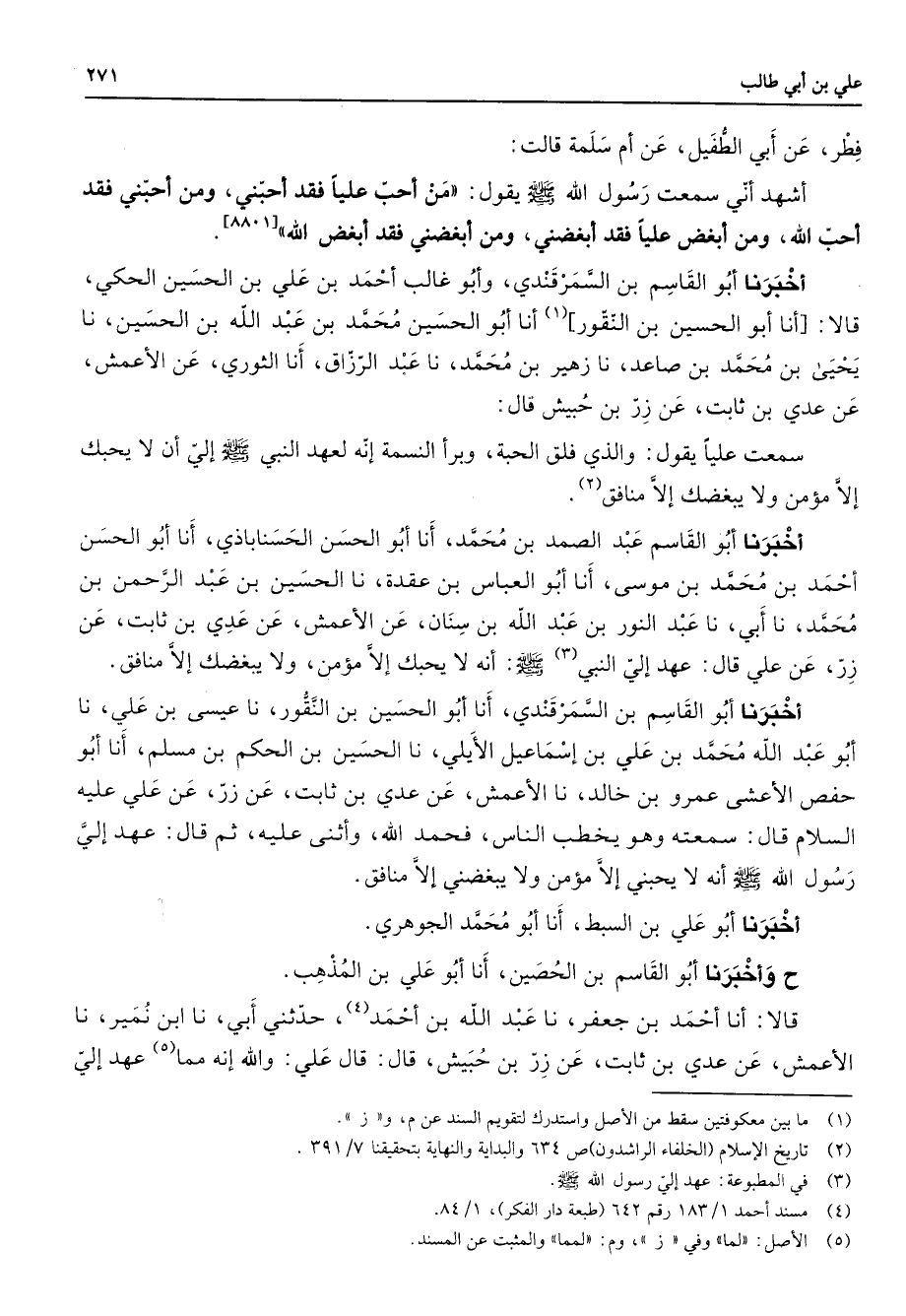 فطر عن أبي الطفيل عن أم سلمة قالت أشهد أني سمعت رسول الله (صلى الله عليه وسلم) يقول من أحب عليا فقد أحبني ومن أحبني فقد أحب الله ومن أبغض عليا فقد أبغضني ومن أبغضني فقد أبغض الله أخبرنا أبو القاسم بن المسرقندي بن علي بن الحسين الحكي قالا أنا أبو الحسين بن النقور (1) أنا أبو الحسين محمد بن عبد الله بن الحسين نا يحيى بن محمد بن صاعد نا زهير بن محمد نا عبد الرزاق أنا الثوري عن الأعمش عن عدي بن ثابت عن زر بن حبيش قال سمعت عليا يقول والذي فلق الحبة وبرا النسمة إنه لعهد النبي (صلى الله عليه وسلم) إلي أن لا يحبك إلا مؤمن ولا يبغضك إلا منافق (2) أخبرنا أبو القاسم عبد الصمد بن محمد أنا أبو الحسن الحسناباذي أنا أبو الحسن أحمد بن محمد بن موسى أنا أبو العباس بن عقدة نا الحسين بن عبد الرحمن بن محمد نا أبي نا عبد النور بن عبد الله بن سنان عن الأعمش عن عدي بن ثابت عن زر عن علي قال عهد إلي النبي (3) (صلى الله عليه وسلم) أنه لا يحبك إلا مؤمن ولا يبغضك إلا منافق أخبرنا أبو القاسم بن السمرقندي أنا أبو الحسين بن النقور نا عيسى بن علي نا أبو عبد الله محمد بن علي بن إسماعيل الأيلي نا الحسين بن الحكم بن مسلم أنا أبو حفص الأعشى عمرو بن خالد نا الأعمش عن عدي بن ثابت عن زر عن علي عليه السلام قال سمعته وهو يخطب الناس فحمد الله وأثنى عليه ثم قال عهد إلي رسول الله (صلى الله عليه وسلم) أنه لا يحبني إلا مؤمن ولا يبغضني إلا منافق أخبرنا أبو علي بن السبط أنا أبو محمد الجوهري ح وأخبرنا أبو القاسم بن الحصين أنا أبو علي بن المذهب قالا أنا أحمد بن جعفر نا عبد الله بن أحمد (4) حدثني أبي نا ابن نمير نا الأعمش عن عدي بن ثابت عن زر بن حبيش قال قال علي والله إنه مما (5) عهد إلي