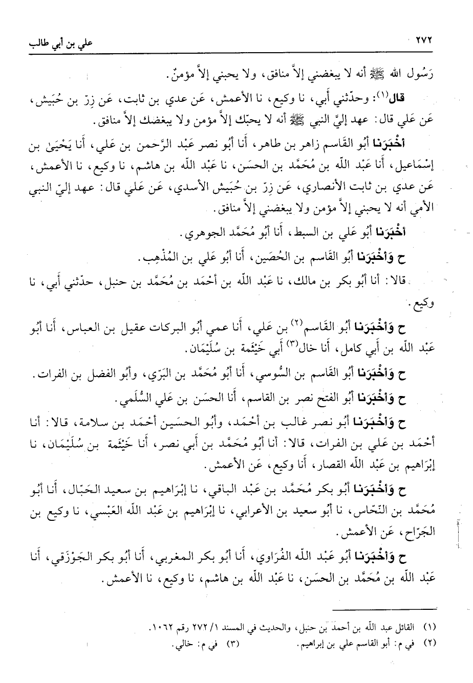 رسول الله (صلى الله عليه وسلم) أنه لا يبغضني إلا منافق ولا يحبني إلا مؤمن قال (1) وحدثني أبي نا وكيع نا الأعمش عن عدي بن ثابت عن زر بن حبيش عن علي قال عهد إلي النبي (صلى الله عليه وسلم) أنه لا يحبك إلا مؤمن ولا يبغضك إلا منافق أخبرنا أبو القاسم بن زاهد طاهر أنا أبو نصر عبد الرحمن بن علي أنا يحيى بن إسماعيل أنا عبد الله بن محمد بن الحسن نا عبد الله بن هاشم وكيع نا الأعمش عن عدي بن ثابت الأنصاري عن زر بن حبيش الأسدي عن علي قال عهد إلي النبي الأمي أنه لا يحبني إلا مؤمن ولا يبغضني إلا منافق أخبرنا أبو علي بن البسط أنا أبو محمد الجوهري ح وأخبرنا أبو القاسم بن الحصين أنا أبو علي بن المذهب قالا أنا أبو بكر بن مالك نا عبد الله بن أحمد بن محمد بن حنبل حدثني أبي نا وكيع ح وأخبرنا أبو القاسم (2) بن علي أنا عمي أبو البركات عقيل بن العباس أنا أبو عبد الله بن ابي كامل أنا خال (3) أبي خيثمة بن سليمان ح وأخبرنا أبو القاسم بن السوسي أنا أبو محمد بن البري وأبو الفضل بن الفرات ح وأخبرنا أبو الفتح نصر بن القاسم أنا الحسن بن علي السلمي ح وأخبرنا أبو نصر غالب بن أحمد وأبو الحسين أحمد بن سلامة قالا انا أحمد بن علي بن الفرات قالا أنا أبو محمد بن أبي نصر أنا خيثمة بن سليمان نا إبراهيم بن عبد الله القصار أنا وكيع عن الأعمش ح وأخبرنا أبو بكر محمد بن عبد الباقي نا إبراهيم بن سعيد الحبال أنا أبو محمد بن النحاس نا أبو سعيد بن الأعرابي نا إبراهيم بن عبد الله العبسي نا وكيع بن الجراح عن الأعمش ح وأخبرنا أبو عبد الله الفراوي أنا أبو بكر المغربي أنا أبو بكر الجوزقي أنا عبد الله بن محمد بن الحسن نا عبد الله بن هاشم نا وكيع نا الأعمش