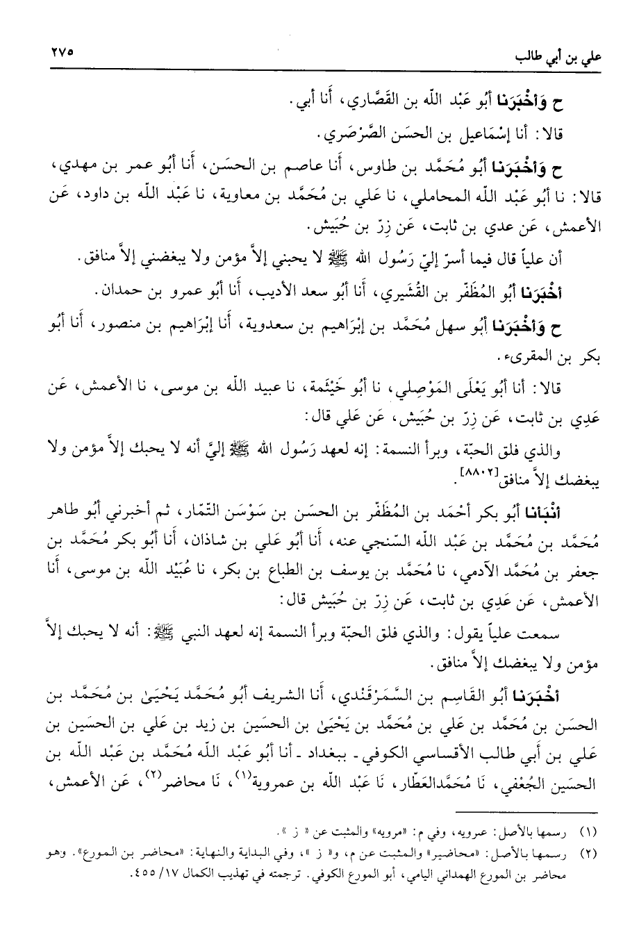 ح وأخبرنا أبو عبد الله بن القصاري أنا أبي قالا أنا إسماعيل بن الحسن الصرصري ح وأخبرنا أبو محمد بن طاوس أنا عاصم بن الحسن أنا أبو عمر بن مهدي قالا نا أبو عبد الله المحاملي نا علي بن محمد بن معاوية نا عبد الله بن داود عن الأعمش عن عدي بن ثابت عن زر بن حبيش أن عليا قال فيما أسر إلي رسول الله (صلى الله عليه وسلم) لا يحبني إلا مؤمن ولا يبغضني إلا منافق أخبرنا أبو المظفر بن القشيري أنا أبو سعد الأديب أنا أبو عمرو بن حمدان ح وأخبرنا أبو سهل محمد بن إبراهيم بن سعدوية أنا إبراهيم بن منصور أنا أبو بكر بن المقرئ قالا أنا أبو يعلى الموصلي نا أبو خيثمة نا عبيد الله بن موسى نا الأعمش عن عدي بن ثابت عن زر بن حبيش عن علي قال والذي فلق الحبة وبرأ النسمة إنه لعهد رسول الله (صلى الله عليه وسلم) إلي أنه لا يحبك إلا مؤمن ولا يبغضك إلا منافق أنبانا أبو بكر أحمد بن المظفر بن الحسن بن سوسن التمار ثم أخبرني أبو طاهر محمد بن محمد بن عبد الله السنجي عنه أنا أبو علي بن شاذان أنا أبو بكر محمد بن جعفر بن محمد الأدمي نا محمد بن يوسف بن الطباع بن بكر نا عبيد الله بن موسى أنا الأعمش عن عدي بن ثابت عن زر بن حبيش قال سمعت عليا يقول والذي فلق الحبة وبرأ النسمة إنه لعهد النبي (صلى الله عليه وسلم) أنه لا يحبك إلا مؤمن ولا يبغضك إلا منافق أخبرنا أبو القاسم بن السمرقندي أنا الشريف أبو محمد يحيى بن محمد بن الحسن بن محمد بن علي بن محمد بن يحيى بن الحسين بن زيد بن علي بن الحسين ين علي بن أبي طالب الأقساسي الكوفي ببغداد أنا أبو عبد الله محمد بن عبد الله بن الحسين الجعفي نا محمد العطار نا عبد الله بن عمروية (1) نا محاضر (2) عن الأعمش