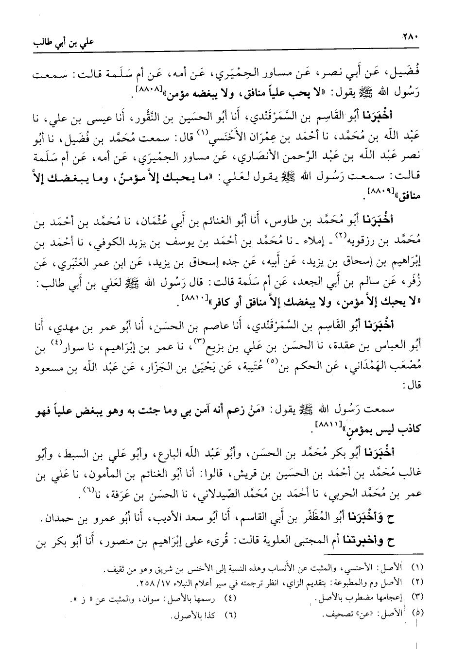 فضيل عن أبي نصر عن مساور الحميري عن أمه عن أم سلمة قالت سمعت رسول الله (صلى الله عليه وسلم) يقول لا يحب عليا منافق ولا يبغضه مؤمن أخبرنا أبو القاسم بن السمرقندي أنا أبو الحسين بن النقور أنا عيسى بن علي نا عبد الله بن محمد نا أحمد بن عمران الأخنسي (1) قال سمعت محمد بن فضيل نا أبو نصر عبد الله بن عبد الرحمن الأنصاري عن مساور الحميري عن أمه عن أم سلمة قالت سمعت رسول الله (صلى الله عليه وسلم) يقول لعلي ما يحبك إلا مؤمن وما يبغضك إلا منافق أخبرنا أبو محمد بن طاوس أنا أبو الغنائم بن أبي عثمان نا محمد بن أحمد بن محمد بن رزقويه (2) أملاء نا محمد بن أحمد بن يوسف بن يزيد الكوفي نا أحمد بن إبراهيم بن إسحاق بن يزيد عن أبيه عن جده إسحاق بن يزيد عن ابن عمر العنبري عن زفر عن سالم بن أبي الجعد عن أم سلمة قالت قال رسول الله (صلى الله عليه وسلم) لعلي بن أبي طالب لا يحبك إلا مؤمن ولا يبغضك إلا منافق أو كافر أخبرنا أبو القاسم بن السمرقندي أنا عاصم بن الحسن أنا أبو عمر بن مهدي أنا أبو العباس بن عقدة نا الحسن بن علي بن بزيع (3) نا عمر بن إبراهيم نا سوار (4) بن مصعب الهمداني عن الحكم بن (5) عتيبة عن يحيى بن الجزار عن عبد الله بن مسعود قال سمعت رسول الله (صلى الله عليه وسلم) يقول من زعم أنه امن بي وما جئت به وهو يبغض عليا فهو كاذب ليس بمؤمن ح أخبرنا أبو بكر محمد بن الحسن وأبو عبد الله البارع وأبو علي بن السبط وأبو غالب محمد بن أحمد بن الحسين بن قريش قالوا أنا أبو الغنائم بن المأمون نا علي بن عمر بن محمد الحربي نا أحمد بن محمد الصيدلاني نا الحسن بن عرفة نا (6) ح وأخبرتنا أبو المظفر بن أبي القاسم أنا أبو سعد الأديب أنا أبو عمرو بن حمدان ح وأخبرنا أم المجتبى العلوية قالت قرئ على إبراهيم بن منصور أنا أبو بكر بن