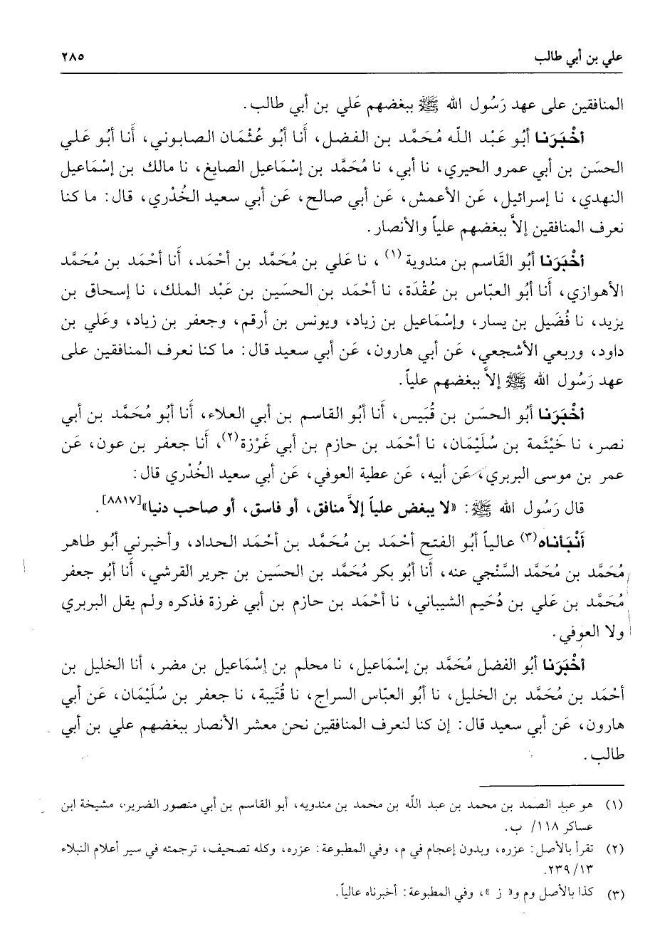 المنافقين على عهد رسول الله (صلى الله عليه وسلم) ببغضهم علي بن أبي طالب أخبرنا أبو عبد الله محمد بن الفضل أنا أبو عثمان الصابوني أنا أبو علي الحسن بن أبي عمرو الحيري نا أبي نا محمد بن إسماعيل الصايغ نا مالك بن إسماعيل النهدي نا إسرائيل عن الأعمش عن أبي صالح عن أبي سعيد الخدري قال ما كنا نعرف المنافقين إلا ببغضهم عليا والأنصار أخبرنا أبو القاسم بن مندوية (1) نا علي بن محمد بن أحمد أنا أحمد بن محمد الأهوازي أنا أبو العباس بن عقدة نا أحمد بن الحسين بن عبد الملك نا إسحاق بن يزيد نا فضيل بن يسار وإسماعيل بن زياد ويونس بن أرقم وجعفر بن زياد وعلي بن داود وربعي الأشجعي عن أبي هارون عن أبي سعيد قال ما كنا نعرف المنافقين على عهد رسول الله (صلى الله عليه وسلم) إلا ببغضهم عليا أخبرنا أبو الحسن بن قبيس أنا أبو القاسم بن أبي العلاء أنا أبو محمد بن أبي نصر نا خيثمة بن سليمان نا أحمد بن حازم بن أبي غرزة (2) أنا جعفر بن عون عن عمر بن موسى البربري عن أبيه عن عطية العوفي عن أبي سعيد الخدري قال قال رسول الله (صلى الله عليه وسلم) لا يبغض عليا إلا منافق أو فاسق أو صاحب دنيا أنباناه (3) عاليا أبو الفتح أحمد بن محمد بن أحمد الحداد وأخبرني أبو طاهر محمد بن محمد السنجي عنه أنا أبو بكر محمد بن الحسين بن جرير القرشي أنا أبو جعفر محمد بن علي بن دحيم الشيباني نا أحمد بن حازم بن أبي غرزة فذكره ولم يقل البربري ولا العوفي أخبرنا أبو الفضل محمد بن إسماعيل نامحلم بن إسماعيل بن مضر أنا الخليل بن أحمد بن محمد بن الخليل نا أبو العباس السراج نا قتيبة نا جعفر بن سليمان عن أبي هارون عن أبي سعيد قال إن كنا لنعرف المنافقين نحن معشر الأنصار ببغضهم علي بن ابي طالب