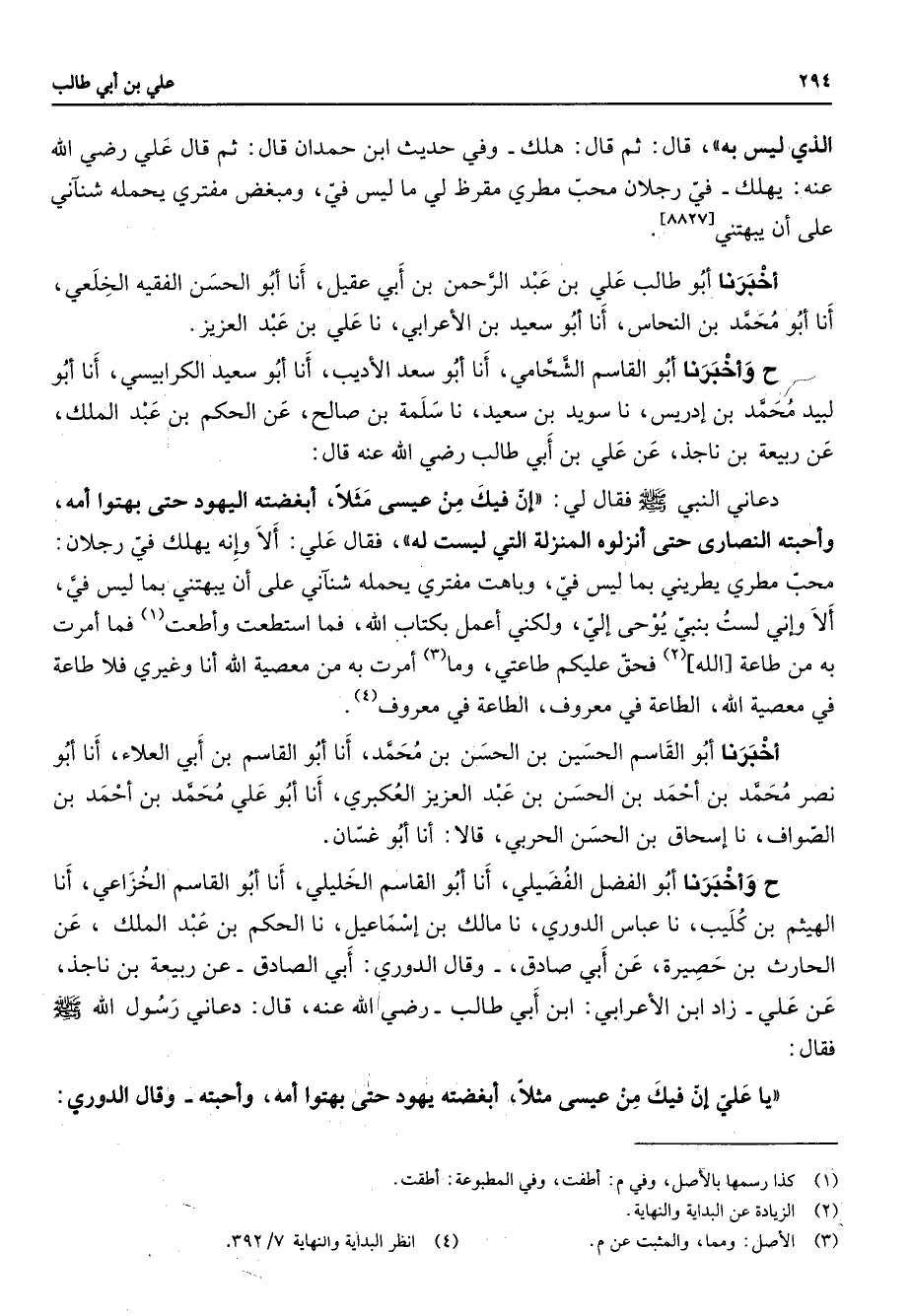 الذي ليس به قال ثم قال هلك وفي حديث ابن حمدان قال ثم قال علي Bهـ يهلك في رجلان محب مطري مقرظ لي ما ليس في ومبغض مفتري يحمله شناني على أن يبهتني أخبرنا أبو طالب علي بن عبد الرحمن بن أبي عقيل أنا أبو الحسن الفقيه الخلعي أنا أبو محمد بن النحاس أنا أبو سعيد بن الأعرابي نا علي بن عبد العزيز ح وأخبرنا أبو القاسم الشحامي أنا أبو سعد الأديب أنا أبو سعيد الكرابيسي أنا أبو لبيد محمد بن إدريس نا سويد بن سعيد نا سلمة بن صالح عن الحكم بن عبد الملك عن ربيعة بن ناجذ عن علي بن أبي طالب Bهـ قال دعاني النبي (صلى الله عليه وسلم) فقال لي إن فيك من عيسى مثلا أبغضته اليهود حتى بهتوا أمه وأحبته النصارى حتى أنزلوه المنزلة التي ليست له فقال علي ألا وإنه يهلك في رجلان محب مطري يطريني بما ليس في وباهت مفتري يحمله شناني على أن يبهتني بما ليس في ألا وإني لست بنبي يوحى إلي ولكني أعمل بكتاب الله فما استطعت وأطعت (1) فما أمرت به من طاعة الله (2) فحق عليكم طاعتي وما (3) أمرت به من معصية الله أنا وغيري فلا طاعة في معصية الله الطاعة في معروف الطاعة في معروف (4) أخبرنا أبو القاسم الحسين بن الحسن بن محمد أنا أبو القاسم بن أبي العلاء أنا أبو نصر محمد بن أحمد بن الحسن بن عبد العزيز العكبري أنا أبو علي محمد بن أحمد بن الصواف نا إسحاق بن الحسن الحربي قالا أنا أبو غسان ح وأخبرنا أبو الفضل الفضيلي أنا أبو القاسم الخليلي أنأ أبو القاسم الخزاعي أنا الهيثم بن كليب نا عباس الدوري نا مالك بن إسماعيل نا الحكم بن عبد الملك عن الحارث بن حصيرة عن أبي صادق وقال الدوري أبي الصادق عن ربيعة بن ناجذ عن علي زاد ابن الأعرابي ابن أبي طالب Bهـ قال دعاني رسول الله (صلى الله عليه وسلم) فقال يا علي إن فيك من عيسى مثلا أبغضته يهود حتى بهتوا أمه وأحبته وقال الدوري