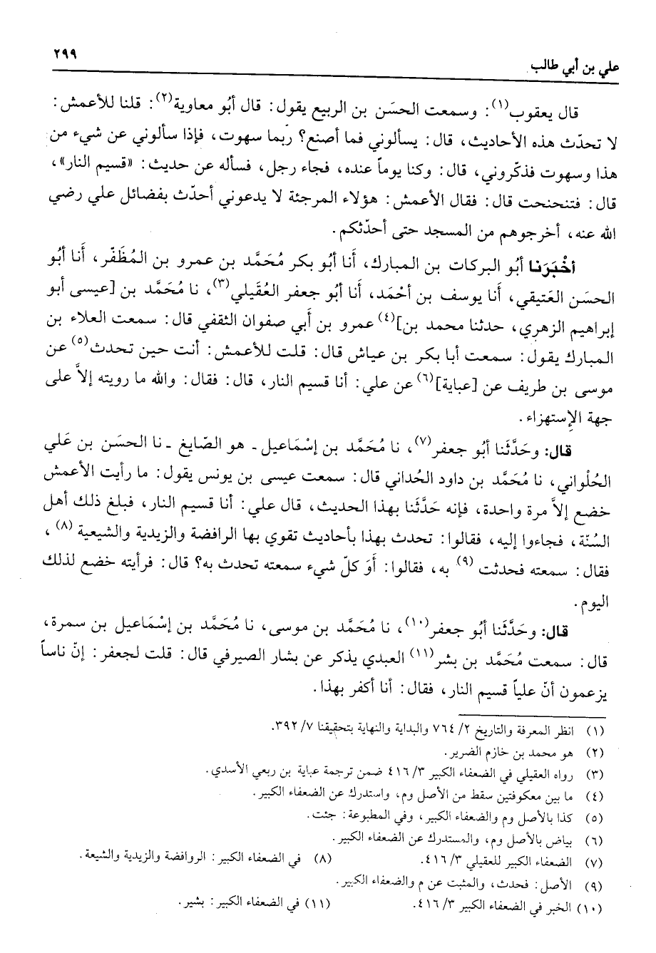 قال يعقوب (1) وسمعت الحسن بن الربيع يقول قال أبو معاوية (2) قلنا للأعمش لا تحدث هذه الأحاديث قال يسألوني فما أصنع ربما سهوت فإذا سألوني عن شئ من هذا وسهوت فذكروني قال وكنا يوما عنده فجاء رجل فسأله عن حديث قسيم النار قال فتنحنحت قال فقال الأعمش هؤلاء المرجئة لا يدعوني أحدث بفضائل علي Bهـ أخرجوهم من المسجد حتى أحدثكم أخبرنا أبو البركات بن المبارك أنا أبو بكر محمد بن عمرو بن المظفر أنا أبو الحسن العتيقي أنا يوسف بن أحمد أنا أبو جعفر العقيلي (3) نا محمد بن عيسى أبو إبراهيم الزهري حدثنا محمد بن (4) عمرو بن أبي صفوان الثقفي قال سمعت العلاء بن المبارك يقول سمعت أبا بكر بن عياش قال قلت للأعمش أنت حين تحدث (5) عن موسى بن طريف عن عباية (6) عن علي أنا قسيم النار قال فقال والله ما رويته إلا على جهة الإستهزاء قال وحدثنا أبو جعفر (7) نا محمد بن إسماعيل هو الصايغ نا الحسن بن علي الحلواني نا محمد بن داود الحداني قال سمعت عيسى بن يونس يقول ما رأيت الأعمش خضع إلا مرة واحدة فإنه حدثنا بهذا الحديث قال علي أنا قسيم النار فبلغ ذلك أهل السنة فجاءوا إليه فقالوا تحدث بهذا بأحاديث تقوي بها الرافضة والزيدية والشيعية (8) فقال سمعته فحدثت (9) به فقالوا أو كل شئ سمعته تحدث به قال فرأيته خضع لذلك اليوم قال وحدثنا أبو جعفر (10) نا محمد بن موسى نا محمد بن إسماعيل بن سمرة قال سمعت محمد بن بشر (11) العبدي يذكر عن بشار الصيرفي قال قلت لجعفر إن ناسا يزعمون أن عليا قسيم النار فقال أنا أكفر بهذا