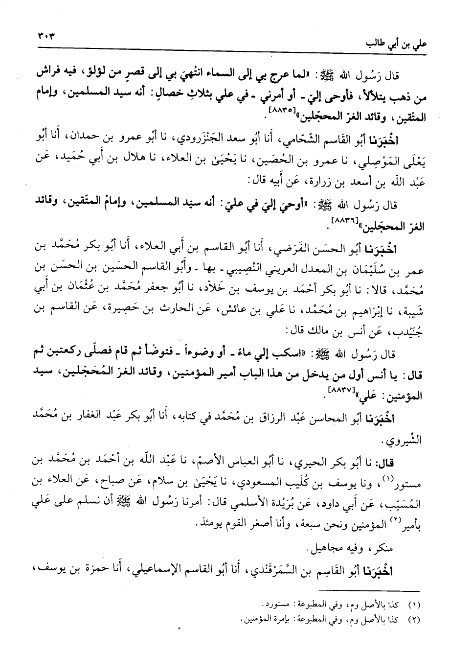 قال رسول الله (صلى الله عليه وسلم) لما عرج بي إلى السماء انتهي بي إلى قصر من لؤلؤ فيه فراش من ذهب يتلألأ فأوحى إلي أو أمرني في علي بثلاث خصال أنه سيد المسلمين وإمام المتقين وقائد الغر المحجلين أخبرنا أبو القاسم الشحامي أنا أبو سعد الجنزرودي نا أبو عمرو بن حمدان أنا أبو يعلى الموصلي نا عمرو بن الحصين نا يحيى بن العلاء ناهلال بن أبي حميد عن عبد الله بن أسعد بن زرارة عن أبيه قال قال رسول الله (صلى الله عليه وسلم) أوحي إلي في علي أنه سيد المسلمين وإمام المتقين وقائد الغر المحجلين أخبرنا أبو الحسن الفرضي أنا أبو القاسم بن أبي العلاء أنا أبو بكر محمد بن عمر بن سليمان بن المعدل العريني النصيبي بها وأبو القاسم الحسين بن الحسن بن محمد قالا نا أبو بكر أحمد بن يوسف بن خلاد نا أبو جعفر بن عثمان بن أبي شيبة نا إبراهيم بن محمد نا علي بن عائش عن الحارث بن حصيرة عن القاسم بن جنيدب عن أنس بن مالك قال قال رسول الله (صلى الله عليه وسلم) اسكب إلي ماء أو وضوءا فتوضأ ثم قام فصلى ركعتين ثم قال يا أنس أول من يدخل من هذا الباب أمير المؤمنين وقائد الغر المحجلين سيد المؤمنين علي أخبرنا أبو المحاسن عبد الرزاق بن محمد في كتابه أنا أبو بكر عبد الغفار بن محمد الشيروي قال نا أبو بكر الحيري نا أبو العباس الأصم نا عبد الله بن أحمد بن محمد بن مستور (1) ونايوسف بن كليب المسعودي نا يحيى بن سلام عن صباح عن العلاء بن المسيب عن أبي داود عن بريدة الأسلمي قال أمرنا رسول الله (صلى الله عليه وسلم) أن نسلم على علي بأمير (2) المؤمنين ونحن سبعة وأنا أصغر القوم يومئذ منكر وفيه مجاهيل أخبرنا أبو القاسم بن السمرقندي أنا أبو القاسم الإسماعيلي أنا حمزة بن يوسف