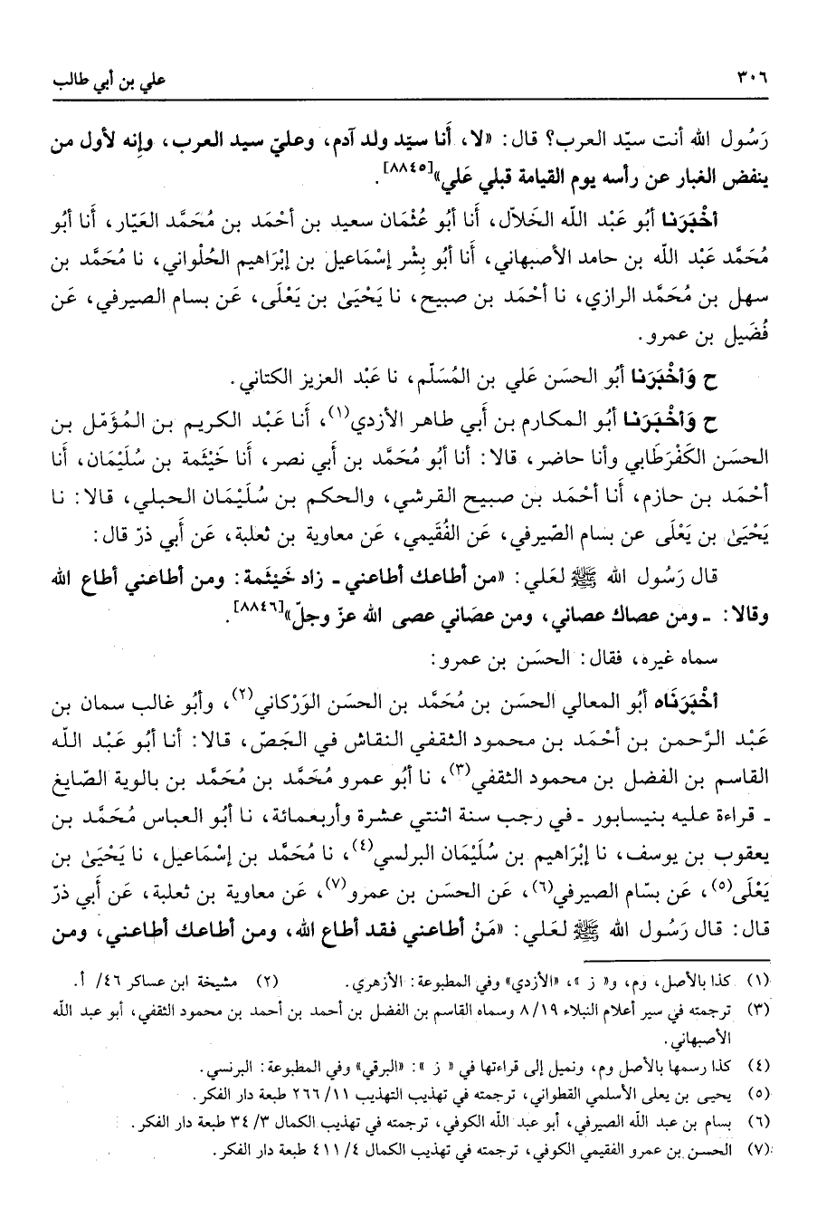 رسول الله أنت سيد العرب قال لا أنا سيد ولد ادم وعلي سيد العرب وإنه لأول من ينفض الغبار عن رأسه يوم القيامة قبلي علي أخبرنا أبو عبد الله الخلال أنا أبو عثمان سعيد بن أحمد بن محمد العيار أنا أبو محمد عبد الله بن حامد الأصبهاني أنا أبو بشر إسماعيل بن إبراهيم الحلواني نا محمد بن سهل بن محمد الرازي نا أحمد بن صبيح نا يحيى بن يعلى عن بسام الصيرفي عن فضيل بن عمرو ح وأخبرنا أبو الحسن علي بن المسلم نا عبد العزيز الكتاني ح وأخبرنا أبو المكارم بن أبي طاهر الأزدي (1) أنا عبد الكريم بن المؤمل بن الحسن الكفر طابي وأنا حاضر قالا أنا أبو محمد بن أبي نصر أنا خيثمة بن سليمان أنا أحمد بن حازم أنا أحمد بن صبيح القرشي والحكم بن سليمان الحبلي قالا نا يحيى بن يعلى عن بسام الصيرفي عن الفقيمي عن معاوية بن ثعلبة عن أبي ذر قال قال رسول الله (صلى الله عليه وسلم) لعلي من أطاعك أطاعني زاد خيثمة ومن أطاعني أطاع الله وقالا ومن عصاك عصاني ومن عصاني عصى الله عز وجل سماه غيره فقال الحسن بن عمرو أخبرناه أبو المعالي الحسن بن محمد بن الحسن الوركاني (2) وأبو غالب سمان بن عبد الرحمن بن أحمد بن محمود الثقفي النقاش في الجص قالا أنا أبو عبد الله القاسم بن الفضل بن محمود الثقفي (3) نا أبو عمرو محمد بن محمد بن بالوية الصايغ قراءة عليه بنيسابور في رجب سنة اثنتي عشرة وأربعمائة نا أبو العباس محمد بن يعقوب بن يوسف نا إبراهيم بن سليمان البرلسي (4) نا محمد بن إسماعيل نا يحيى بن يعلى (5) عن بسام الصيرفي (6) عن الحسن بن عمرو (7) عن معاوية بن ثعلبة عن أبي ذر قال قال رسول الله (صلى الله عليه وسلم) لعلي من أطاعني فقد أطاع الله ومن أطاعك أطاعني ومن
