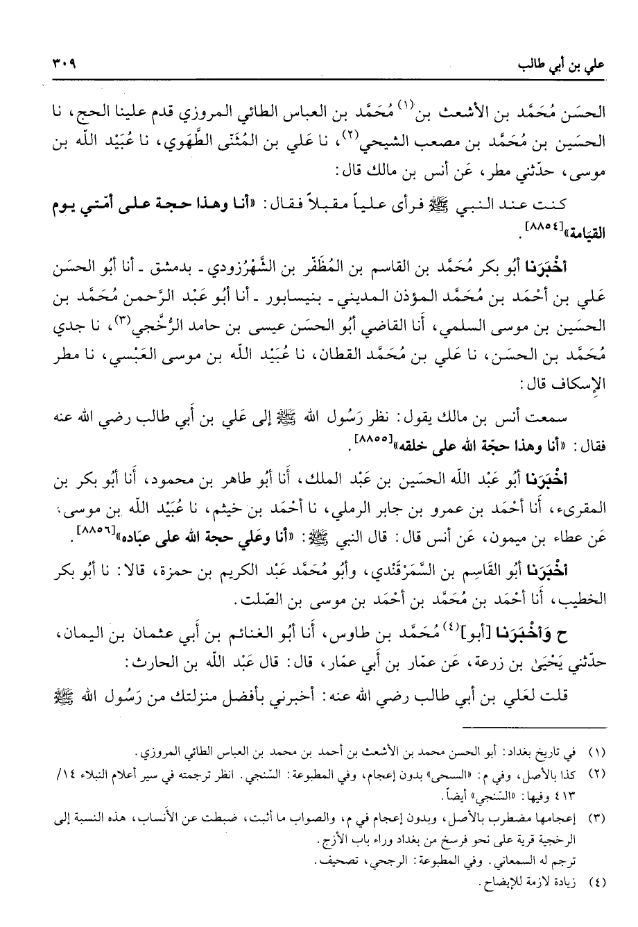الحسن محمد بن الأشعث بن (1) محمد بن العباس الطائي المروزي قدم علينا الحج نا الحسين بن محمد بن مصعب الشيحي (2) نا علي بن المثنى الطهوي نا عبيد الله بن موسى حدثني مطر عن أنس بن مالك قال كنت عند النبي (صلى الله عليه وسلم) فرأى عليا مقبلا فقال أنا وهذا حجة على أمتي يوم القيامة أخبرنا أبو بكر محمد بن القاسم بن المظفر بن الشهرزودي بدمشق أنا أبو الحسن علي بن أحمد بن محمد المؤذب المديني بنيسابور أنا أبو عبد الرحمن محمد بن الحسين بن موسى السلمي أنا القاضي أبو الحسن عيسى بن حامد الرخجي (3) نا جدي محمد بن الحسن نا علي بن محمد القطان نا عبيد الله بن موسى العبسي نامطر الإسكاف قال سمعت أنس بن مالك يقول نظر رسول الله (صلى الله عليه وسلم) إلى علي بن أبي طالب Bهـ فقال أنا وهذا حجة الله على خلقه أخبرنا أبو عبد الله الحسين بن عبد الملك أنا أبو طاهر بن محمود أنا أبو بكر بن المقرئ أنا أحمد بن عمرو بن جابر الرملي نا أحمد بن خيثم نا عبيد الله بن موسى عن عطاء بن ميمون عن أنس قال قال النبي (صلى الله عليه وسلم) أنا وعلي حجة الله على عباده أخبرنا أبو القاسم بن السمرقندي وأبو محمد عبد الكريم بن حمزة قالا نا أبو بكر الخطيب أنا أحمد بن محمد بن أحمد بن موسى بن الصلت ح وأخبرنا أبو (4) محمد بن طاوس أنا أبو الغنائم بن أبي عثمان بن اليمان حدثني يحيى بن زرعة عن عمار بن أبي عمار قال قال عبد الله بن الحارث قلت لعلي بن أبي طالب Bهـ أخبرني بأفضل منزلتك من رسول الله (صلى الله عليه وسلم)