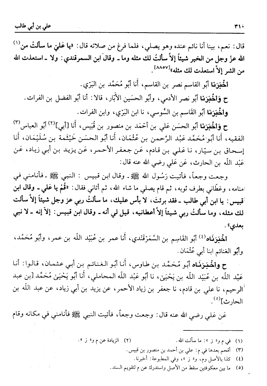 قل نعم بينا أنا نائم عنده وهو يصلي فلما فرغ من صلاته قال يا علي ما سألت من (1) الله عز وجل من الخير شيئا إلا سألت لك مثله وما وقال ابن السمرقندي ولا أستعذت الله من الشر إلا استعذت لك مثله أخبرنا أبو القاسم نصر بن القاسم أنا أبو محمد بن البري ح وأخبرنا أبو نصر الأدمي وأبو الحسين الأبار قالا أنا أبو الفضل بن الفرات وأخبرنا أبو القاسم بن السوسي نا أبن البري وأبن الفرات واخبرنا أبو القاسم بن السوسي نا ابن البري وابن الفرات وأخبرنا أبو الحسن علي بن أحمد بن منصور بن قبيس أنا أبي (2) أبو العباس (3) الفقيه أنا أبو محمد عبد الرحمن بن عثمان أنا أبو الحسن خيثمة بن سليمان أنا إسحاق بن سيار نا علي بن قادم عن جعفر الأحمر عن يزيد بن أبي زياد عن عبد الله بن الحارث عن علي Bهـ قال وجعت وجعا فأتيت رسول الله (صلى الله عليه وسلم) وقال ابن قبيس النبي (صلى الله عليه وسلم) فأنامني في منامه وغطاني بطرف ثوبه ثم قام يصلي ما شاء الله ثم أتاني فقال قم يا علي وقال ابن قبيس يا ابن أبي طالب فقد برئت لا بأس عليك ما سألت ربي عز وجل شيئا إلا سألت لك مثله وما سألت ربي شيئا إلا أعطانيه قيل لي أنه وقال ابن قبيس إلا إنه لا نبي بعدي أخبرناه (4) أبو القاسم بن السمرقندي أنا عمر بن عبيد الله بن عمر وأبو محمد وأبو الغنائم ابنا أبي عثمان ح وأخبرناه أبو محمد بن طاوس أنا أبو الغنائم بن أبي عثمان قالوا أنا عبد الله بن عبيد الله بن يحيى نا أبن عبد الله المحاملي أنا أبو يحيى محمد بن عبد الرحيم نا علي بن قادم نا جعفر بن زياد الأحمر عن يزيد بن أبي زياد عن عبد الله بن الحارث (5) عن علي Bهـ قال وجعت وجعا فأتيت النبي (صلى الله عليه وسلم) فأنامني في مكانه وقام