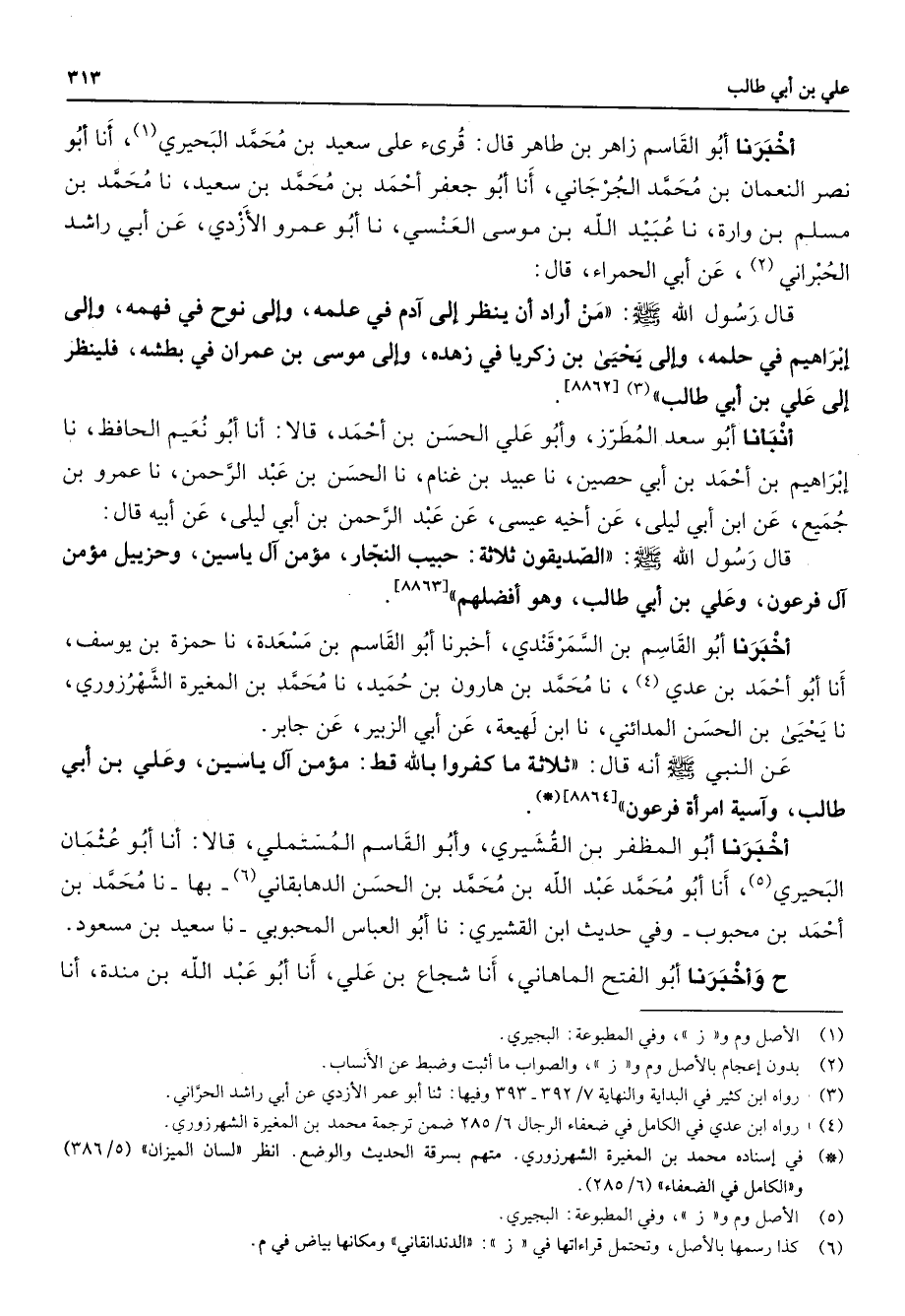 أخبرنا أبو القاسم زاهر بن طاهر قال قرئ على سعيد بن محمد البحيري (1) أنا أبو نصر النعمان بن محمد الجرجاني أنا أبو جعفر أحمد بن محمد بن سعيد نا محمد بن مسلم بن وارة نا عبيد الله بن موسى العنسي نا أبو عمرو الأزدي عن أبي راشد الحبراني (2) عن أبي الحمراء قال قال رسول الله (صلى الله عليه وسلم) من أراد أن ينظر إلى ادم في علمه وإلى نوح في فهمه وإلى إبراهيم في حلمه وإلى يحيى بن زكريا في زهده وإلى موسى بن عمران في بطشه فلينظر إلى علي بن أبي طالب (3) أنبانا أبو سعد المطرز وأبو علي الحسن بن أحمد قالا أنا أبو نعيم الحافظ نا إبراهيم بن أحمد بن أبي حصين نا عبيد بن غنام نا الحسين بن عبد الرحمن نا عمرو بن جميع عن ابن أبي ليلى عن أخيه عيسى عن عبد الرحمن بن أبي ليلى عن أبيه قال قال رسول الله (صلى الله عليه وسلم) الصديقون ثلاثة حبيب النجار مؤمن ال ياسين وحزبيل مؤمن ال فرعون وعلي بن أبي طالب وهو أفضلهم أخبرنا أبو القاسم بن السمرقندي أخبرنا أبو القاسم بن مسعدة نا حمزة بن يوسف أنا أبو أحمد بن عدي (4) نا محمد بن هارون بن حميد نا محمد بن المغيرة الشهرزوري نا يحيى بن الحسن المدائني نا ابن لهيعة عن أبي الزبير عن جابر عن النبي (صلى الله عليه وسلم) أنه قال ثلاثة ما كفروا بالله قط مؤمن ال ياسين وعلي بن أبي طالب واسية امرأة فرعون أخبرنا أبو المظفر بن القشيري وأبوب القاسم المستملي قالا أنا أبو عثمان البحيري (5) أنا أبو محمد عبد الله بن محمد بن الحسن الدهابقاني (6) بها نا محمد بن أحمد بن محبوب وفي حديث ابن القشيري نا أبو العباس المحبوبي نا سعيد بن مسعود ح وأخبرنا أبو الفتح الماهاني أنا شجاع بن علي أنا أبو عبد الله بن مندة أنا