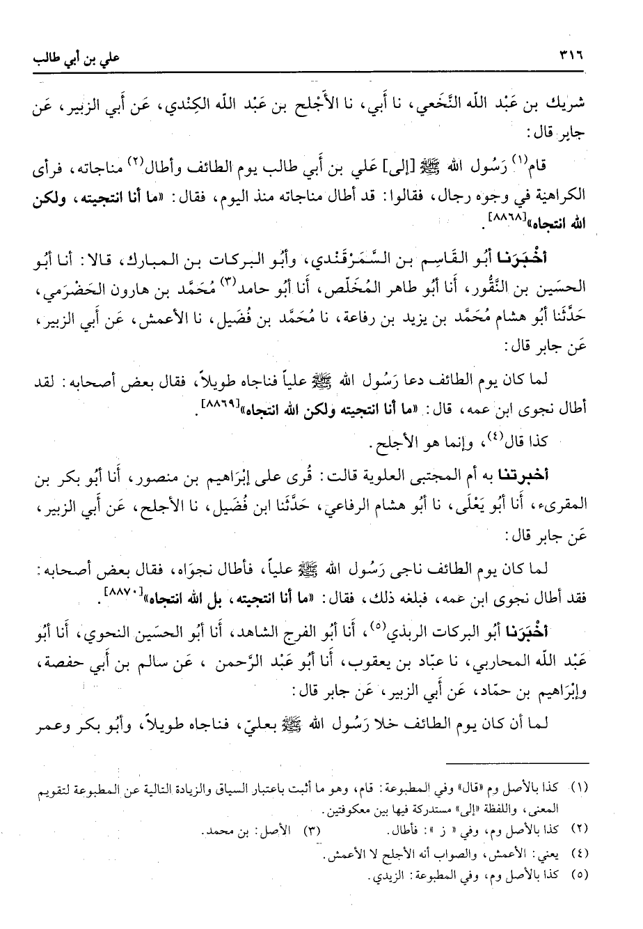 شريك بن عبد الله النخعي نا أبي نا الأجلح بن عبد الله الكندي عن أبي الزبير عن جابر قال قام (1) رسول الله (صلى الله عليه وسلم) إلى علي بن أبي طالب يوم الطائف وأطال (2) مناجاته فرأى الكراهية في وجوه رجال فقالوا قد أطال مناجاته منذ اليوم فقال ما أنا انتجيته ولكن الله انتجاه أخبرنا أبو القاسم بن السمرقندي وأبو البركات بن المبارك قالا أنا أبو الحسين بن النقور أنا أبو طاهر المخلص أنا أبو حامد (3) محمد بن هارون الحضرمي حدثنا أبو هشام محمد بن يزيد بن رفاعة نا محمد بن فضيل نا الأعمش عن أبي الزبير عن جابر قال لما كان يوم الطائف دعا رسول الله (صلى الله عليه وسلم) عليا فناجاه طويلا فقال بعض أصحابه لقد أطال نجوى ابن عمه قاما أنا انتجيته ولكن الله انتجاه كذا قال (4) وإنما هو الأجلح أخبرتنا به أم المجتبى العلوية قالت قرئ على إبراهيم بن منصور أنا أبو بكر بن المقرئ أنا أبو يعلى نا أبو هشام الرفاعي حدثنا ابن فضيل نا الأجلح عن أبي الزبير عن جابر قال لما كان يوم الطائف ناجى رسول الله (صلى الله عليه وسلم) عليا فأطال نجواه فقال بعض أصحابه فقد أطال نجوى ابن عمه فبلغه ذلك فقال ما أنا انتجيته بل الله أنتجاه أخبرنا أبو البركات الربذي (5) أنا أبو الفرج الشاهد أنا أبو الحسين النحوي أنا أبو عبد الله المحاربي نا عباد بن يعقوب أنا أبو عبد الرحمن عن سالم بن أبي حفصة وإبراهيم بن حماد عن أبي الزبير عن جابر قال لما أن كان يوم الطائف خلا رسول الله (صلى الله عليه وسلم) بعلي فناجاه طويلا وأبو بكر وعمر