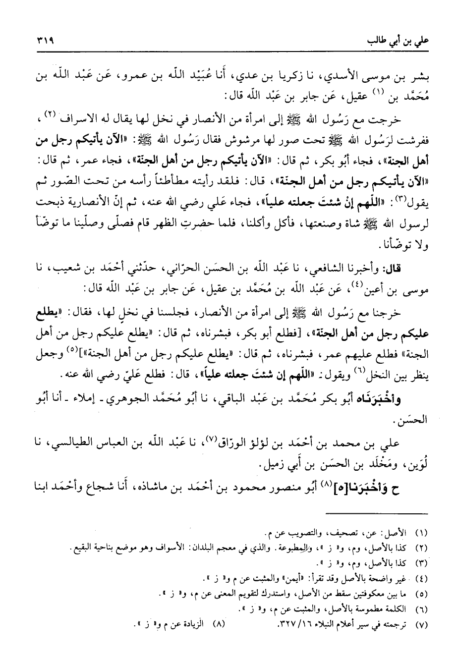بشر بن موسى الأسدي نا زكريا بن عدي أنا عبيد الله بن عمرو عن عبد الله بن محمد بن (1) عقيل عن جابر بن عبد الله قال خرجت مع رسول الله (صلى الله عليه وسلم) إلى امرأة من الأنصار في نخل لها يقال له الاسراف (2) ففرشت لرسول الله (صلى الله عليه وسلم) تحت صور لها مرشوش فقال رسول الله (صلى الله عليه وسلم) ألان يأتيكم رجل من أهل الجنة فجاء أبو بكر ثم قال ألان يأتيكم رجل من أهل الجنة فجاء عمر ثم قال الان يأتيكم رجل من أهل الجنة قال فلقد رأيته مطأطئا رأسه من تحت الصور ثم يقول (3) اللهم إن شئت جعلته عليا فجاء علي Bهـ ثم إن الأنصارية ذبحت لرسول الله (صلى الله عليه وسلم) شاة وصنعتها فأكل وأكلنا فلما حضرت الظهر قام فصلى وصلينا ما توضأ ولا توضأنا قال وأخبرنا الشافعي نا عبد الله بن الحسن الحراني حدثني أحمد بن شعيب نا موسى بن أعين (4) عن عبد الله بن محمد بن عقيل عن جابر بن عبد الله قال خرجنا مع رسول الله (صلى الله عليه وسلم) إلى امرأة من الأنصار فجلسنا في نخل لها فقال يطلع عليكم رجل من أهل الجنة فطلع أبو بكر فبشرناه ثم قال يطلع عليكم رجل من أهل الجنة فطلع عليهم عمر فبشرناه ثم قال يطلع عليكم رجل من أهل الجنة (5) وجعل ينظر بين النخل (6) ويقول اللهم إن شئت جعلته عليا قال فطلع علي Bهـ وأخبرناه أبو بكر محمد بن عبد الباقي نا أبو محمد الجوهري إملاء أنا أبو الحسن علي بن محمد بن أحمد بن لؤلؤ الوراق (7) نا عبد الله بن العباس الطيالسي نا لوين ومخلد بن الحسن بن أبي زميل ح وأخبرناه (8) أبو منصور محمود بن أحمد بن ماشاذه أنا شجاع وأحمد ابنا