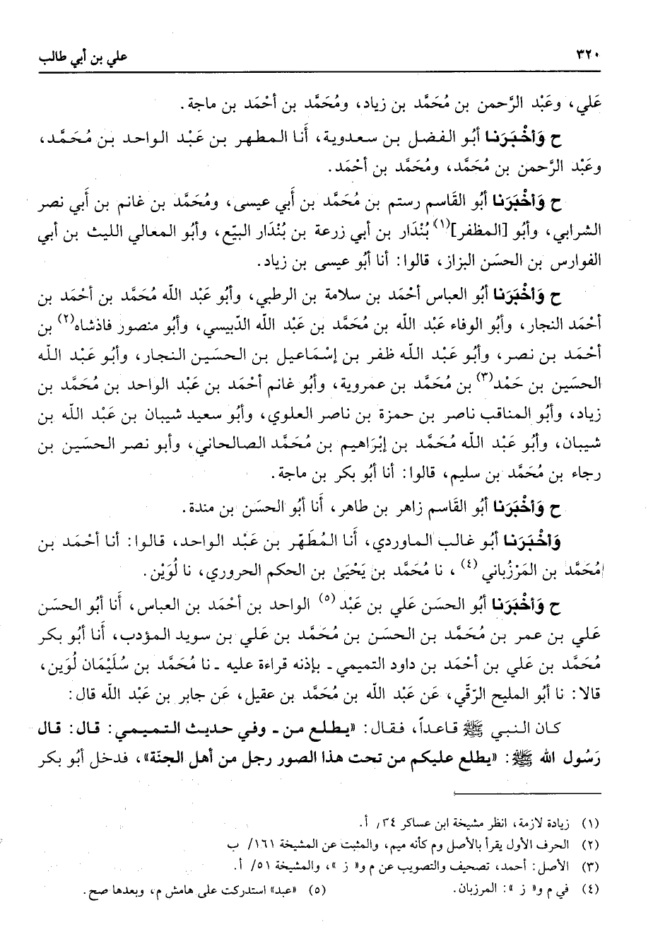 علي وعبد الرحمن بن محمد بن زياد ومحمد بن أحمد بن ماجة وأخبرنا أبو الفضل بن سعدوية أنا المطهر بن عبد الواحد بن محمد وعبد الرحمن بن محمد ومحمد بن أحمد ح وأخبرنا أبو القاسم رستم بن محمد بن أبي عيسى ومحمد بن غانم بن أبي نصر الشرابي وأبو المظفر (1) بندار بن أبي زرعة بن بندار البيع وأبو المعالي الليث بن أبي الفوارس بن الحسن البزاز قالوا أنا أبو عيسى بن زياد ح وأخبرنا أبو العباس أحمد بن سلامة بن الرطبي وأبو عبد الله محمد بن احمد بن أحمد النجار وأبو الوفاء عبد الله بن محمد بن عبد الله الدبيسي وأبو منصور فاذشاه (2) بن أحمد بن نصر وأبو عبد الله ظفر بن إسماعيل بن الحسين النجار وأبو عبد الله الحسين بن حمد (3) بن محمد بن عمروية وأبو غانم أحمد بن عبد الواحد بن محمد بن زياد وأبو المناقب ناصر بن حمزة بن ناصر العلوي وأبو سعيد شيبان بن عبد الله بن شيبان وأبو عبد الله محمد بن إبراهيم بن محمد الصالحاني وأبو نصر الحسين بن رجاء بن محمد بن سليم قالوا أنا أبو بكر بن ماجة ح وأخبرنا أبو القاسم زاهر بن طاهر أنا أبو الحسن بن مندة وأخبرنا أبو غالب الماوردي أنا المطهر بن عبد الواحد قالوا أنا أحمد بن محمد بن المرزباني (4) نا محمد بن يحيى بن الحكم الحروري نا لوين ح وأخبرنا أبو الحسن علي بن عبد (5) الواحد بن أحمد بن العباس أنا أبو الحسن علي بن عمر بن محمد بن الحسن بن محمد بن علي بن سويد المؤدب أنا أبو بكر محمد بن علي بن أحمد بن داود التميمي بإذنه قراءة عليه نا محمد بن سليمان لوين قالا نا أبو المليح الرقي عن عبد الله بن محمد بن عقيل عن جابر بن عبد الله قال كان النبي (صلى الله عليه وسلم) قاعدا فقال يطلع من وفي حديث التميمي قال قال رسول الله (صلى الله عليه وسلم) يطلع عليكم من تحت هذا الصور رجل من أهل الجنة فدخل أبو بكر