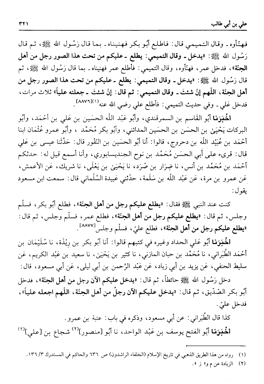 فهنأوه وقال التميمي قال فاطلع أبو بكر فهنيناه بما قال رسول الله (صلى الله عليه وسلم) ثم قال رسول الله (صلى الله عليه وسلم) يدخل وقال التميمي يطلع عليكم من تحت هذا الصور رجل من أهل الجنة فدخل عمر فهنأوه وقال التميمي فأطلع عمر فهنيناه بما قال رسول الله (صلى الله عليه وسلم) ثم قال رسول الله (صلى الله عليه وسلم) يدخل وقال التميمي يطلع عليكم من تحت هذا الصور رجل من أهل الجنة اللهم إن شئت وقال التميمي ثم قال غن شئت جعلته عليا ثلاث مرات فدخل علي وفي حديث التميمي فأطلع علي Bهـ (1) أخبرنا أبو القاسم بن السمرقندي وأبو عبد الله الحسين بن علي بن أحمد وأبو البركات يحيى بن الحسن بن الحسين المدائني وأبو بكر محمد وأبو عمرو عثمان ابنا أحمد بن عبيد الله بن دحروج قالوا أنا أبو الحسين بن النقور قال حدثنا عيسى بن علي قال قرئ على أبي الحسن محمد بن نوح الجنديسابوري وأنا أسمع قيل له حدثكم احمد بن محمد بن أنس ناضرار بن صرد نا يحيى بن يعلى نا شريك عن الأعمش عن عمرو بن مرة عن عبد الله بن سلمة حدثني عبيدة السلماني قال سمعت ابن مسعود يقول كنت عند النبي (صلى الله عليه وسلم) فقال يطلع عليكم رجل من أهل الجنة فطلع أبو بكر فسلم وجلس ثم قال يطلع عليكم رجل من أهل الجنة فطلع عمر فسلم وجلس ثم قال يطلع عليكم رجل من أهل الجنة فطلع علي فسلم وجلس أخبرنا أبو علي الحداد وغيره في كتبهم قالوا أنا أبو بكر بن ريذة نا سليمان بن أحمد الطبراني نا محمد بن حبان المازني ناكثير بن يحيى نا سعيد بن عبد الكريم عن سليط الحنفي عن يزيد بن أبي زياد عن عبد الرحمن بن أبي ليلى عن أبي مسعود قال دخل رسول الله (صلى الله عليه وسلم) حائطا ثم قال يدخل عليكم الان رجل من أهل الجنة فدخل أبو بكر الصديق ثم قال يدخل عليكم الان رجل من أهل الجنة اللهم أجعله عليا فدخل علي كذا قال الطبراني عن أبي مسعود وذكره في باب عتبة بن عمرو أخبرنا أبو الفتح يوسف بن عبد الواحد نا أبو منصور (2) شجاع بن علي (2)