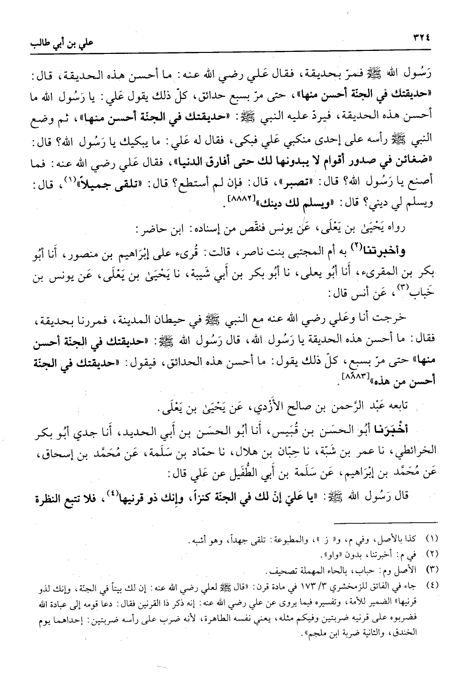 رسول الله (صلى الله عليه وسلم) فمر بحديقة فقال علي Bهـ ما أحسن هذه الحديقة قال حديقتك في الجنة أحسن منها حتى مر بسبع حدائق كل ذلك يقول علي يا رسول الله ما أحسن هذه الحديقة فيرد عليه النبي (صلى الله عليه وسلم) حديقتك في الجنة أحسن منها ثم وضع النبي (صلى الله عليه وسلم) رأسه على إحدى منكبي علي فبكى فقال له علي ما يبكيك يارسول الله قال ضغائن في صدور أقوام لا يبدونها لك حتى أفارق الدنيا فقال علي Bهـ فما أصنع يا رسول الله قال تصبر قال فإن لم أستطع قال تلقى جميلا (1) قال ويسلم لي ديني قال ويسلم لك دينك رواه يحيى بن يعلى عن يونس فنقص من إسناده ابن حاضر وأخبرتنا (2) به أم المجتبى بنت ناصر قالت قرئ على إبراهيم بن منصور أنا أبو بكر بن المقرئ أنا أبو يعلى نا أبو بكر بن أبي شيبة نا يحيى بن يعلى عن يونس بن خباب (3) عن أنس قال خرجت أنا وعلي Bهـ مع النبي (صلى الله عليه وسلم) في حيطان المدينة فمررنا بحديقة فقال ما أحسن هذه الحديقة يا رسول الله قال رسول الله (صلى الله عليه وسلم) حديقتك في الجنة أحسن منها حتى مر بسبع كل ذلك يقول ما أحسن هذه الحدائق فيقول حديقتك في الجنة أحسن من هذه تابعه عبد الرحمن بن صالح الأزدي عن يحيى بن يعلى أخبرنا أبو الحسن بن قبيس أنا أبو الحسن بن أبي الحديد أنا جدي أبو بكر الخرائطي نا عمر بن شبة نا حبان بن هلال نا حماد بن سلمة عن محمد بن إسحاق عن محمد بن إبراهيم عن سلمة بن أبي الطفيل عن علي قال قال رسول الله (صلى الله عليه وسلم) يا علي إن لك في الجنة كنزا وإنك ذو قرنيها (4) فلا تتبع النظرة