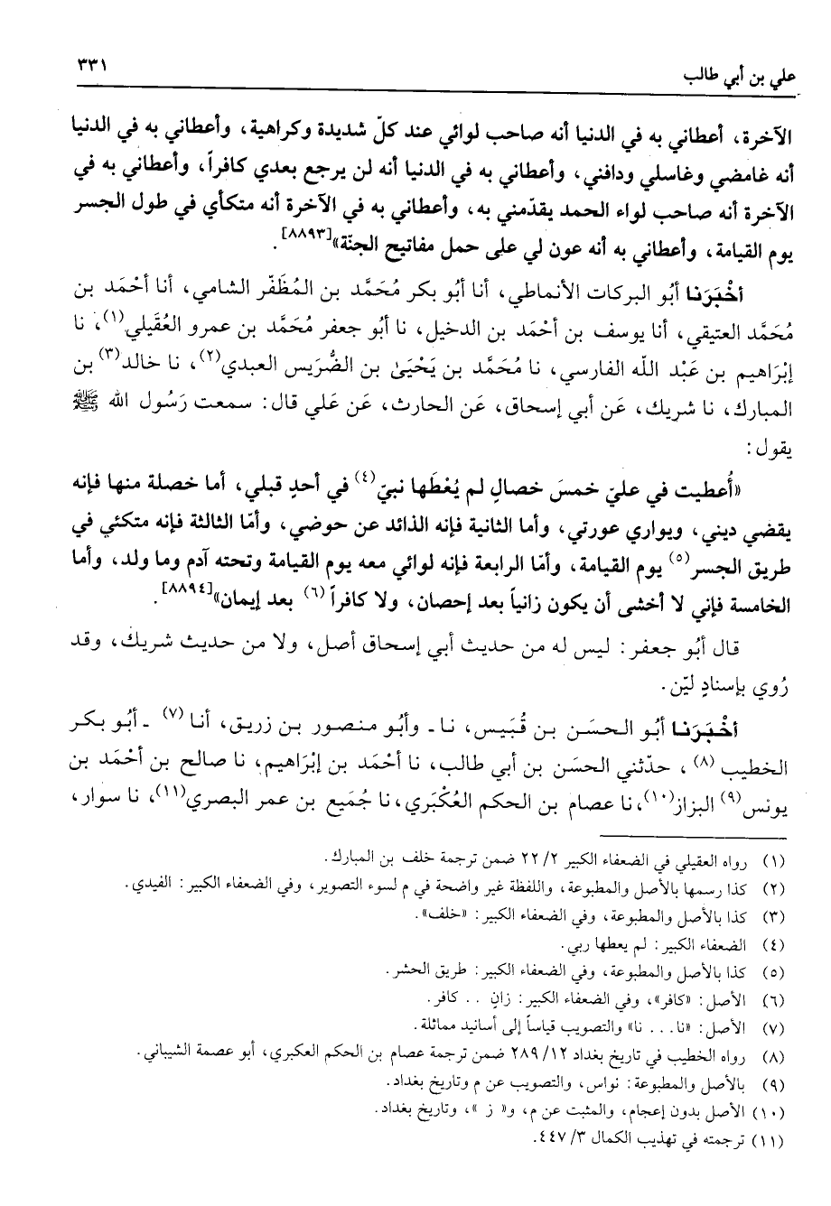 الدنيا وخصالا في الاخرة أعطاني به في الدنيا أنه صاحب لوائي عند كل شديدة وكراهية وأعطاني به في الدنيا أنه غامضي وغاسلي ودافني وأعطاني به في الدنيا أنه لن يرجع بعدي كافرا وأعطاني به في الاخرة أنه صاحب لواء الحمد يقدمي به وأعطاني به في الاخرة أنه متكأي في طول الجسر يوم القيامة وأعطاني به أنه عون لي على حمل مفاتيح الجنة أخبرنا أبو البركات الأنماطي أنا أبو بكر محمد بن المظفر الشامي أنا أحمد بن محمد العتيقي أنا يوسف بن أحمد بن الدخيل نا أبو جعفر محمد بن عمرو العقيلي (1) نا إبراهيم بن عبد الله الفارسي نا محمد بن يحيى بن الضريس العبدي (2) نا خالد (3) بن المبارك نا شريك عن أبي إسحاق عن الحارث عن علي قال سمعت رسول الله (صلى الله عليه وسلم) يقول أعطيت في علي خمس خصال لم يعطها نبي (4) في أحد قبلي أما خصلة منها فإنه يقضي ديني ويواري عورتي وأما الثانية فإنه الذائد عن حوضي وأما الثالثة فإنه متكئي في طريق الجسر (5) يوم القيامة وأما الرابعة فإنه لوائي معه يوم القيامة وتحته ادم وما ولد وأما الخامسة فإني لا أخشى أن يكون زانيا بعد إحصان ولا كافرا (6) بعد إيمان قال أبو جعفر ليس له من حديث أبي إسحاق أصل ولامن حديث شريك وقد روي بإسناد لين أخبرنا أبو الحسن بن قبيس نا وأبو منصور بن زريق أنا (7) أبو بكر الخطيب (8) حدثني الحسن بن أبي طالب نا أحمد بن إبراهيم نا صالح بن أحمد بن يونس (9) البزاز (10) نا عصام بن الحكم العكبري نا جميع بن عمر البصري (11) نا سوار