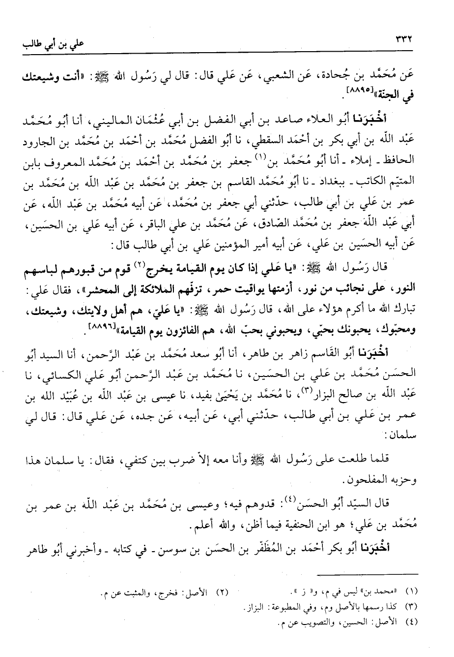 عن محمد بن جحادة عن الشعبي عن علي قال قال لي رسول الله (صلى الله عليه وسلم) أنت وشيعتك في الجنة أخبرنا أبو العلاء صاعد بن أبي الفضل بن أبي عثمان الماليني أنا أبو محمد عبد الله بن أبي بكر بن أحمد السقطي نا أبو الفضل محمد بن أحمد بن محمد بن الجارود الحافظ إملاء أنا أبو محمد بن جعفر بن محمد بن (1) أحمد بن محمد المعروف بابن المتيم الكاتب ببغداد نا أبو محمد القاسم بن جعفر بن محمد بن عبد الله بن محمد بن عمر بن علي بن أبي طالب حدثني أبي جعفر بن محمد عن أبيه محمد بن عبد الله عن أبي عبد الله جعفر بن محمد الصادق عن محمد بن علي الباقر عن أبيه علي بن الحسين عن أبيه الحسين بن علي عن أبيه أمير المؤمنين علي بن أبي طالب قال قال رسول الله (صلى الله عليه وسلم) يا علي إذا كان يوم القيامة يخرج (2) قوم من قبورهم لباسهم النور على بخائب من نور أزمتها يواقيت حمر تزفهم الملائكة إلى المحشر فقال علي تبارك الله ما أكرم هؤلاء على الله قال رسول الله (صلى الله عليه وسلم) يا علي هم أهل ولايتك وشيعتك ومحبوك يحبونك بحبي ويحبوني بحب الله هم الفائزون يوم القيامة أخبرنا أبو القاسم زاهر بن طاهر أنا أبو سعد محمد بن عبد الرحمن أنا السيد أبو الحسن محمد بن علي بن الحسين نا محمد بن عبد الرحمن أبو علي الكسائي نا عبد الله بن صالح البزار (3) نا محمد بن يحيى بفيد نا عيسى بن عبد الله بن عبيد الله بن عمر بن علي بن أبي طالب حدثني أبي عن أبيه عن جده عن علي قال قال لي سلمان قلما طلعت على رسول الله (صلى الله عليه وسلم) وأنا معه إلا ضرب بين كتفي فقال يا سلمان هذا وحزبه المفلحون قال السيد أبو الحسن (4) قدوهم فيه وعيسى بن محمد بن عبد الله بن عمر بن