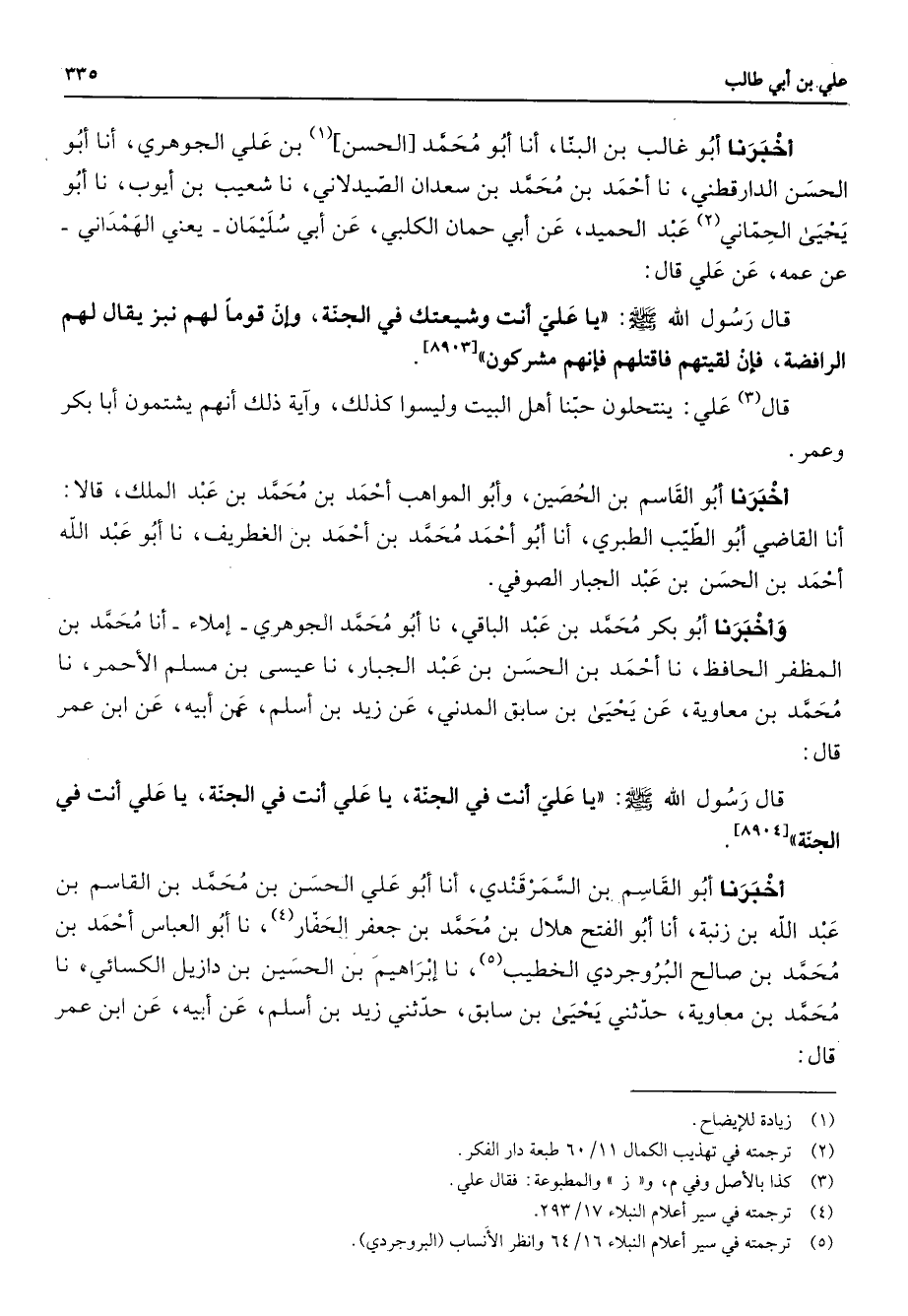 أخبرنا أبو غالب بن البنا أنا أبو محمد الحسن (1) بن علي الجوهري أنا أبو الحسن الدارقطني نا أحمد بن محمد بن سعدان الصيدلاني نا شعيب بن أيوب نا أبو يحيى الحماني (2) عبد الحميد عن أبي حمان الكلبي عن أبي سليمان يعني الهمداني عن عمه عن علي قال قال رسول الله (صلى الله عليه وسلم) يا علي أنت وشيعتك في الجنة وإن قوما لهم نبز يقال لهم الرافضة فإن لقيتهم فاقتلهم فإنهم مشركون قال علي ينتحلون حبنا أهل البيت وليسوا كذلك واية ذلك أنهم يشتمون أبا بكر وعمر أخبرنا أبو القاسم بن الحصين وأبو المواهب أحمد بن محمد بن عبد الملك قالا أنا القاضي أبو الطيب الطبري أنا أبو أحمد محمد بن أحمد بن الغطريف نا أبو عبد الله أحمد بن الحسن بن عبد الجبار الصوفي وأخبرنا أبو بكر محمد بن عبد الباقي نا أبو محمد الجوهري إملاء أنا محمد بن المظفر الحافظ نا أحمد بن الحسن بن عبد الجبار نا عيسى بن مسلم الأحمر نا محمد بن معاوية عن يحيى بن سابق المدني عن زيد بن أسلم عن أبيه عن ابن عمر قال قال رسول الله (صلى الله عليه وسلم) يا علي أنت في الجنة يا علي أنت في الجنة يا علي أنت في الجنة أخبرنا أبو القاسم بن السمرقندي أنا أبو علي الحسن بن محمد بن القاسم بن عبد الله بن زنبة أنا أبو الفتح هلال بن محمد بن جعفر الحفار (4) نا أبو العباس أحمد بن محمد بن صالح البروجردي الخطيب (5) نا أبراهيم بن الحسين بن دازيل الكسائي نا محمد بن معاوية حدثني يحيى بن سابق حدثني زيد بن أسلم عن أبيه عن ابن عمر قال