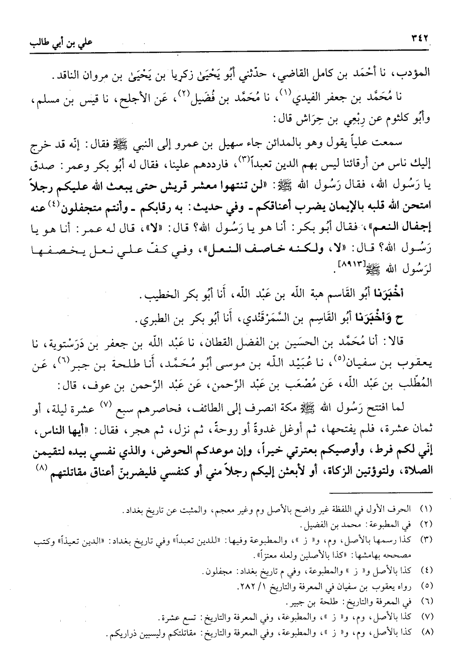 المؤدب نا أحمد بن كامل القاضي حدثني أبو يحيى زكريا بن يحيى بن مروان الناقد نا محمد بن جعفر الفيدي (1) نا محمد بن فضيل (2) عن الأجلح نا قيس بن مسلم وأبو كلثوم عن ربعي بن حراش قال سمعت عليا يقول وهو بالمدائن جاء سهيل بن عمرو إلى النبي (صلى الله عليه وسلم) فقال إنه قد خرج إليك ناس من أرقائنا ليس بهم الدين تعبدا (3) فارددهم علينا فقال له أبو بكر وعمر صدق يا رسول الله (صلى الله عليه وسلم) فقال رسول الله (صلى الله عليه وسلم) لن تنتهوا معشر قريش حتى يبعث الله عليكم رجلا امتحن الله قلبه بالإيمان يضرب أعناقكم وفي حديث به رقابكم وأنتم متجفلون (4) عنه إجفال النعم فقال أبو بكر أنا هو يا رسول الله قال لا قال له عمر أنا هو يا رسول الله قال لا ولكنه خاصف النعل وفي كف على نعل يخصفها لرسول الله (صلى الله عليه وسلم) أخبرنا أبو القاسم هبة الله بن عبد الله أنا أبو بكر الخطيب ح وأخبرنا أبو القاسم بن السمرقندي أنا أبو بكر بن الطبري قالا أنا محمد بن الحسين بن الفضل القطان نا عبد الله بن جعفر بن درستوية نا يعقوب بن سفيان (5) نا عبيد الله بن موسى أبو محمد أنا طلحة بن جبر (6) عن المطلب بن عبد الله عن مصعب بن عبد الرحمن عن عبد الرحمن بن عوف قال لما افتتح رسول الله (صلى الله عليه وسلم) مكة انصرف إلى الطائف فحاصرهم سبع (7) عشرة ليلة أو ثمان عشرة فلم يفتحها ثم أوغل غدوة أو روحة ثم نزل ثم هجر فقال أيها الناس إني لكم فرط وأوصيكم بعترتي خيرا وإن موعدكم الحوض والذي نفسي بيده لتقيمن الصلاة ولتوؤتين الزكاة أو لأبعثن إليكم رجلا من أو كنفسي فليضربن أعناق مقاتلتهم (8)