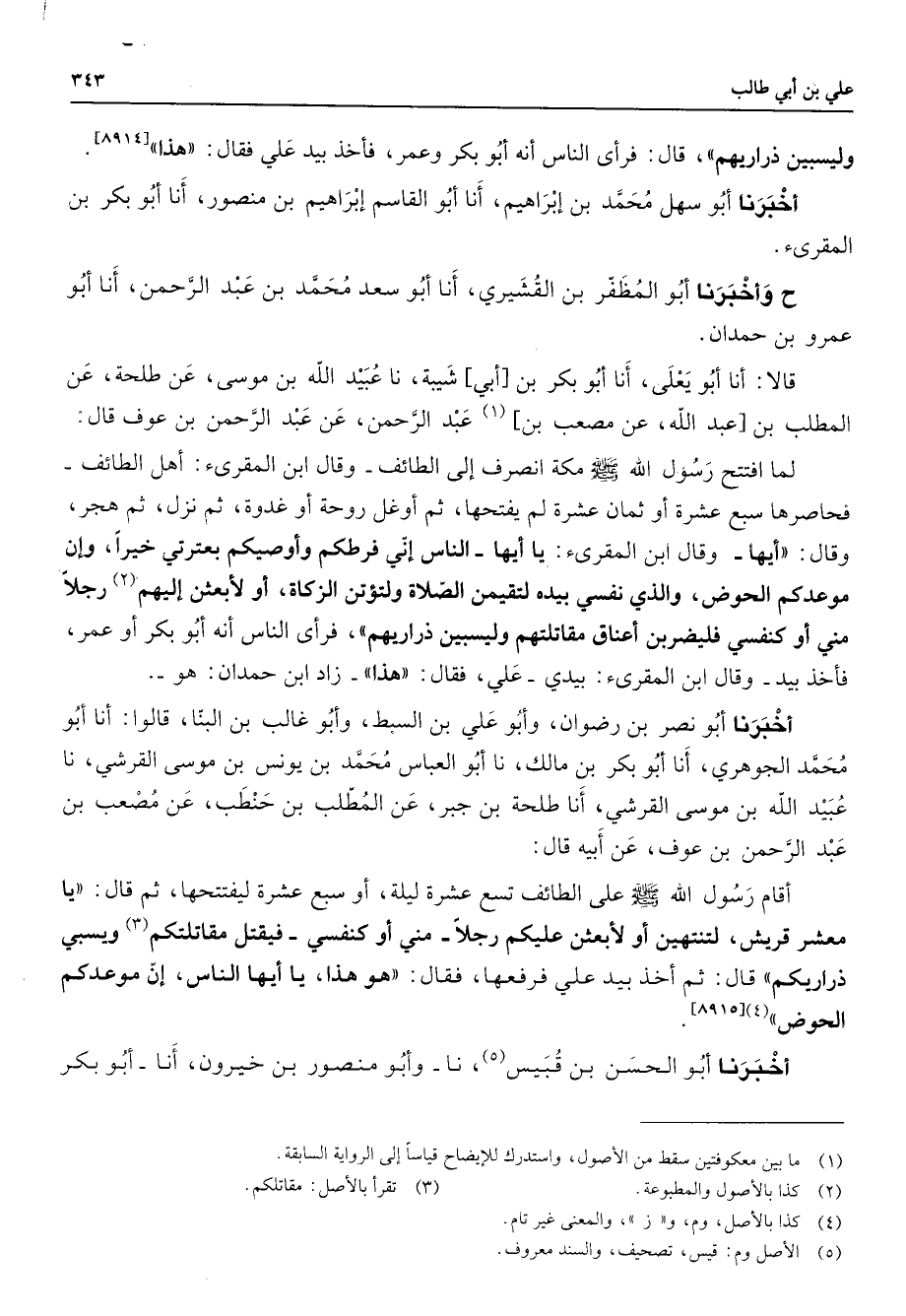 وليسبين ذراريهم قال فرأى الناس أنه أبو بكر وعمر فأخذ بيد علي فقال هذا أخبرنا أبو سهل محمد بن إبراهيم أنا أبو القاسم إبراهيم بن منصور أنا أبو بكر بن المقرئ ح وأخبرنا أبو المظفر بن القشيري أنا أبو سعد محمد بن عبد الرحمن أنا أبو عمرو بن حمدان قالا أنا أبو يعلى أنا أبو بكر بن أبي شيبة نا عبيد الله بن موسى عن طلحة عن المطلب بن عبد الله عن مصعب بن (1) عبد الرحمن عن عبد الرحمن بن عوف قال لما افتتح رسول الله (صلى الله عليه وسلم) مكة انصرف إلى الطائف وقال ابن المقرئ أهل الطائف فحاصرها سبع عشرة أو ثمان عشرة لم يفتحها ثم أوغل روحة أو غدوة ثم نزل ثم هجر وقال أيها وقال ابن المقرئ يا أيها الناس إني فرطكم وأوصيكم بعترتي خيرا وإن موعكم الحوض والذي نفسي بيده لتقيمن الصلاة ولتؤتن الزكاة أو لأبعثن إليهم (2) رجلا مني أو كنفسي فليضربن أعناق مقاتلتهم وليسبين ذراريهم فرأى الناس أنه أبو بكر أو عمر فأخذ بيد وقال ابن المقرئ بيدي علي فقال هذا زاد ابن حمدان هو أخبرنا أبو نصر بن رضوان وأبو علي بن السبط وأبو غالب بن البنا قالوا أنا أبو محمد الجوهري أنا أبو بكر بن مالك نا أبو العباس محمد بن يونس بن موسى القرشي نا عبيد الله بن موسى القرشي أنا طلحة بن جبر عن المطلب بن حنطب عن مصعب بن عبد الرحمن بن عوف عن أبيه قال أقام رسول الله (صلى الله عليه وسلم) على الطائف تسع عشرة ليلة أو سبع عشرة ليفتتحها ثم قال يا معشر قريش لتنتهين أو لأبعثن عليكم رجلا مني أو كنفسي فيقتل مقاتلتكم (3) ويسبي ذراريكم قال ثم أخذ بيد علي فرفعها فقال هو هذا يا أيها الناس إن موعدكم الحوض (4) أخبرنا أبو الحسن بن قبيس (5) نا وأبو منصور بن خيرون أنا أبو بكر