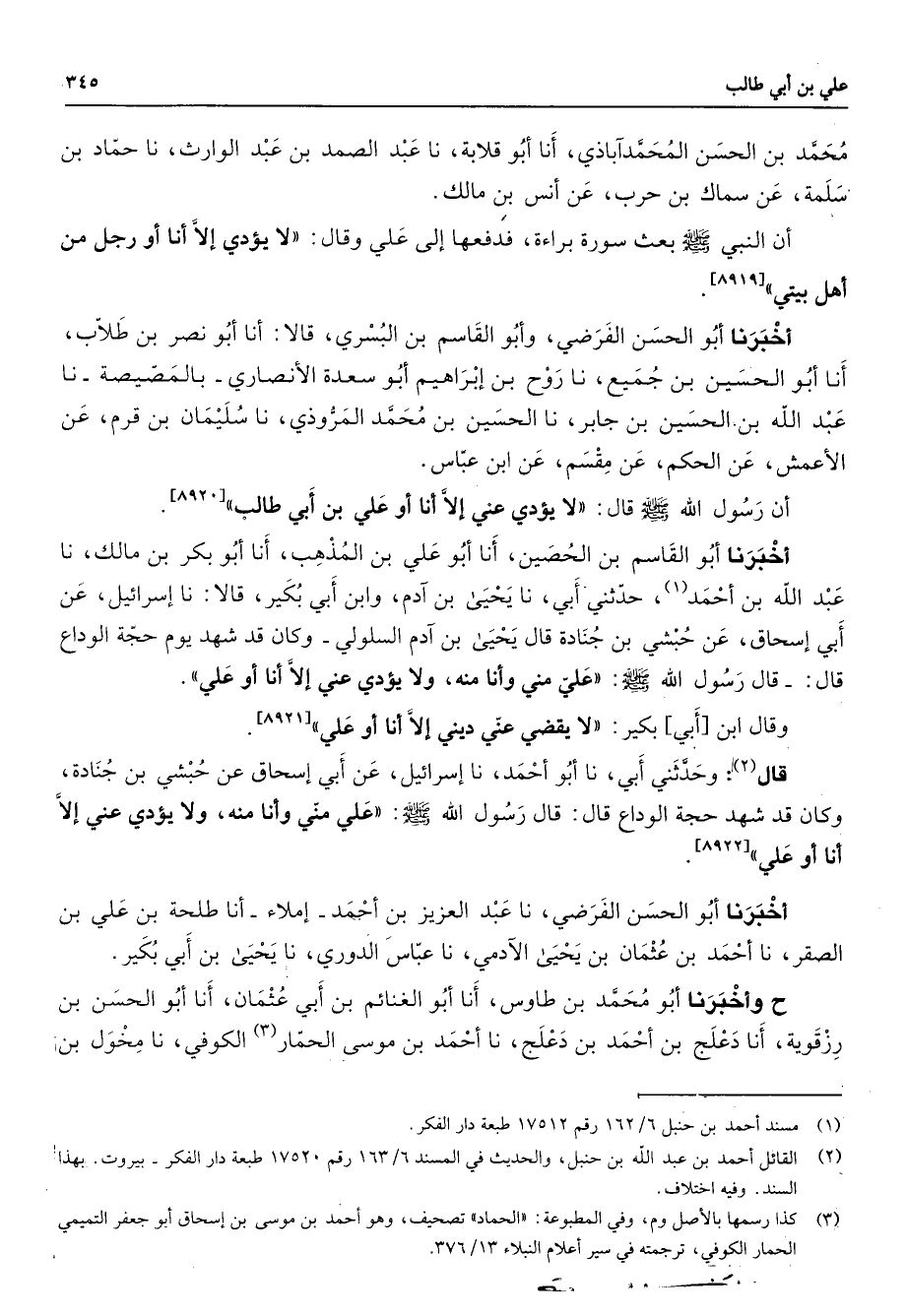 محمد بن الحسن المحمد اباذي أنا أبو قلابة نا عبد الصمد بن عبد الوراث نحماد سلمة عن سماك بن حرب عن أنس بن مالك أن النبي (صلى الله عليه وسلم) بعث سورة براءة فدفعها إلى علي وقال لا يؤدي إلا أنا أو رجل من أهل بيتي أخبرنا أبو الحسن الفرضي وأبو القاسم بن البسري قالا أنا أبو نصر بن طلاب أنا أبو الحسين بن جميع نا روح بن إبراهيم أبو سعدة الأنصاري بالمصيصة نا عبد الله بن الحسين بن جابر نا الحسين بن محمد المروذي نا سليمان بن قرم عن الأعمش عن الحكم عن مقسم عن ابن عباس أن رسول الله (صلى الله عليه وسلم) قال لا يؤدي عني إلا أنا أو علي بن أبي طالب أخبرنا أبو القاسم بن الحصين أنا أبو علي بن المذهب أنا أبو بكر بن مالك نا عبد الله بن أحمد (1) حدثني أبي نا يحيى بن ادم وابن أبي بكير قالا نا إسرائيل عن أبي إسحاق عن حبشي بن جنادة قال يحيى بن ادم السلولي وكان قد شهد يوم حجة الوداع قال قال رسول الله (صلى الله عليه وسلم) علي مني وأنا منه ولا يؤدي عن إلا أنا أو علي وقال ابن أبي بكير لا يقضي عني ديني إلا أنا أو علي قال (2) وحدثني أبي نا أبو أحمد نا إسرائيل عن أبي إسحاق عن حبشي بن جنادة وكان قد شهد حجة الوداع قال قال رسول الله (صلى الله عليه وسلم) علي مني وأنا منه ولا يؤدي عني إلا أنا أو علي أخبرنا أبو الحسن الفرضي نا عبد العزيز بن أحمد إملاء أنا طلحة بن علي بن الصقر نا أحمد بن عثمان بن يحيى الادمي نا عباس الدوري نا يحيى بن أبي بكير ح وأخبرنا أبو محمد بن طاوس أنا أبو الغنائم بن أبي عثمان أنا أبو الحسن بن رزقوية أنا دعلج بن أحمد بن دعلج نا أحمد بن موسى الحمار (3) الكوفي نا مخول بن