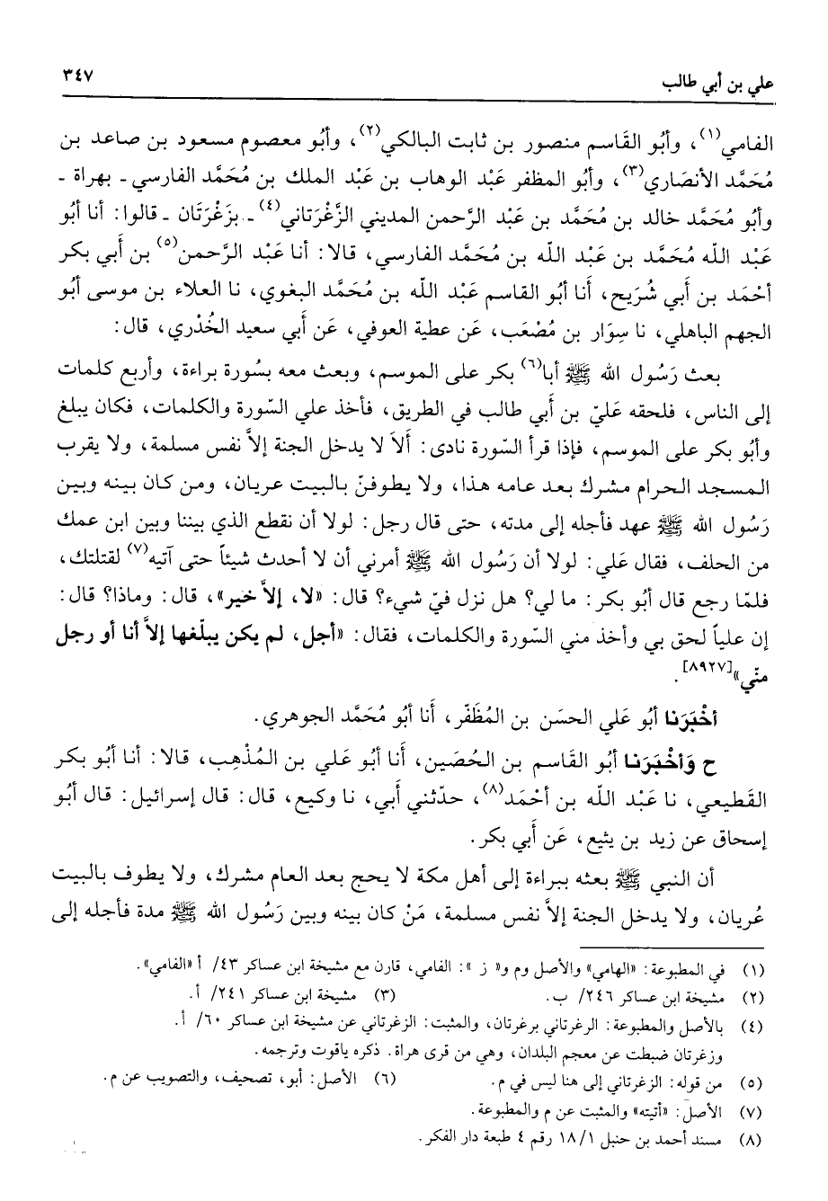 الفامي (1) وأبو القاسم منصور بن ثابت البالكي (2) وأبو معصوم مسعود بن صاعد بن محمد الأنصاري (3) وأبو المظفر عبد الوهاب بن عبد الملك بن محمد الفارسي بهراة وأبو محمد خالد بن محمد بن عبد الرحمن المديني الزغرتاني (4) بزغرتان قالوا أنا أبو عبد الله محمد بن عبد الله بن محمد الفارسي قالا أنا عبد الرحمن (5) بن أبي بكر أحمد بن أبي شريح أنا أبو القاسم عبد الله بن محمد البغوي نا العلاء بن موسى أبو الجهم الباهلي نا سوار بن مصعب عن عطية العوفي عن أبي سعيد الخدري قال بعث رسول الله (صلى الله عليه وسلم) أنا (6) بكر على الموسم وبعث معه بسورة براءة وأربع كلمات إلى الناس فلحقه علي بن أبي طالب في الطريق فأخذ علي السورة والكلمات فكان يبلغ وأبو بكر على الموسم فإذا قرأ السورة نادى ألا لا يدخل الجنة إلا نفس مسلمة ولا يقرب المسجد الحرام مشرك بعد عامه هذا ولا يطوفن بالبيت عريان ومن كان بينه وبين رسول الله (صلى الله عليه وسلم) عهد فأجله إلى مدته حتى قال رجل لولا أن نقطع الذي بيننا وبين ابن عمك من الحلف فقال علي لولا أن رسول الله (صلى الله عليه وسلم) أمرني أن لا أحدث شيئا حتى اتيه (7) لقتلتك فلما رجع قال أبو بكر مالي هل نزل في شئ قال لا إلا خير قال وماذا قال إن عليا لحق بي وأخذ مني السورة والكلمات فقال أجل لم يكن يبلغها إلا أنا أبو رجل مني أخبرنا أبو علي الحسن بن المظفر أنا أبو محمد الجوهري ح وأخبرنا أبو القاسم بن الحصين أنا أبو علي بن المذهب قالا أنا أبو بكر القطيعي نا عبد الله بن أحمد (8) حدثني أبي ناوكيع قال قال إسرائيل قال أبو إسحاق عن زيد بن يثيع عن أبي بكر أن النبي (صلى الله عليه وسلم) بعثه ببراءة إلى أهل مكة لا يحج بعد العام مشرك ولا يطوف بالبيت عريان ولا يدخل الجنة إلا نفس مسلمة من كان بينه وبين رسول الله (صلى الله عليه وسلم) مدة فأجله إلى