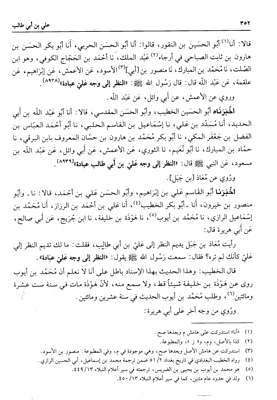 قالا أنا (1) أبو الحسين بن النقور قالوا أنا أبو الحسن الحربي أنا أبو بكر الحسن هارون بن ثابت الصباحي في أرجاء (2) عبد الملك نا أحمد بن الحجاج الكوفي وهو ابن الصلت نا محمد بن المبارك نا منصور بن أبي (3) الأسود عن الأعمش عن إبراهيم عن علقمة عن عبد الله قال قال رسول الله (صلى الله عليه وسلم) النظر إلى وجه علي عبادة وروي عن الأعمش عن أبي وأئل عن عبد الله أخبرناه أبو الحسين الخطيب وأبو الحسن المقدسي قالا أنا أبو عبد الله بن أبي الحديد أنا مسدد بن علي نا إسماعيل بن القاسم الحلبي نا أبو أحمد العباس بن الفضل بن جعفر المكي نا أبو بكر محمد بن هارون بن حسان المعروف بابن البرقي نا حماد بن المبارك نا أبو نعيم نا الثوري عن الأعمش عن أبي وائل عن عبد الله بن مسعود عن النبي (صلى الله عليه وسلم) قال النظر إلى وجه علي بن أبي طالب عبادة وروي عن معاذ بن جبل أخبرنا أبو القاسم علي بن إبراهيم وأبو الحسن علي بن أحمد قالا نا وأبو منصور بن خيرون أنا أبو بكر الخطيب (4) أنا علي بن أحمد بن الرزاز أنا محمد بن إسماعيل الرازي نا محمد بن أيوب (5) نا هوذة بن خليفة نا ابن جريج عن أبي صالح عن أبي هريرة قال رأيت معاذ بن جبل يديم النظر إلى علي بن أبي طالب فقلت ما لك تديم النظر إلى علي كأنك لم تره فقال سمعت رسول الله (صلى الله عليه وسلم) يقول النظر إلى وجه علي عبادة قال الخطيب وهذا الحديث بهذا الإسناد باطل على أنا لا نعلم أن محمد بن أيوب روى عن هوذة بن خليفة شيئا قط ولا سمع منه لأن هوذة مات في سنة ست عشرة ومائتين (6) وطلب محمد بن أيوب الحديث في سنة عشرين ومائتين وروي من وجه اخر على أبي هريرة