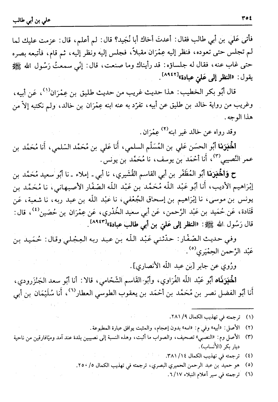 فأتى علي بن أبي طالب فقال أعدت أخاك أبا بجيد قال لم أعلم قال عزمت عليك ل لم تجلس حتى تعوده فنظر إليه عمران مقبلا فجلس إليه ونظر إليه ثم قام فأتبعه بصره حتى غاب عنه فقال له جلساؤه قد رأيناك وما صنعت قال إني سمعت رسول الله (صلى الله عليه وسلم) يقول النظر إلى علي عبادة قال أبو بكر الخطيب هذا حديث غريب من حديث طليق بن عمران (1) عن أبيه وغريب من رواية خالد بن طليق عن أبيه تفرد به عنه ابنه عمران بن خالد ولم نكتبه إلا من هذا الوجه وقد رواه عن خالد غير ابنه (2) عمران أخبرنا أبو الحسن علي بن المسلم السلمي أنا علي بن محمد السلمي أنا محمد بن عمر النصيبي (3) أنا أحمد بن يوسف نا محمد بن يونس ح وأخبرنا أبو المظفر بن أبي القاسم القشيري نا أبي إملاء نا أبو سعيد محمد بن إبراهيم الأديب أنا أبو عبد الله محمد بن عبد الله الصفار الأصبهاني نا محمد بن يونس بن موسى نا إبراهيم بن إسحاق الجعفي نا عبد الله بن عبد ربه نا شعبة عن قتادة عن حميد بن عبد الرحمن عن أبي سعيد الخدري عن عمران بن حصين (4) قال قال رسول الله (صلى الله عليه وسلم) النظر إلى علي بن أبي طالب عبادة وفي حديث الصفار حدثني عبد الله بن عبد ربه العجلي وقال حميد بن عبد الرحمن الحميري (5) وروي عن جابر بن عبد الله الأنصاري أخبرناه أبو عبد الله الفراوي وأبو القاسم الشحامي قالا أنا أبو سعد الجنزرودي أنا أبو الفضل نصر بن محمد بن أحمد بن يعقوب الطوسي العطار (6) أنا سليمان بن أبي