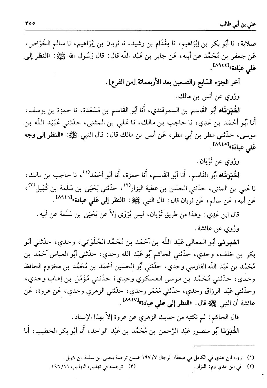 صلابة نا أبو بكر بن إبراهيم نامقدام بن رشيد نا ثوبان بن إبراهيم نا سالم الخواص عن جعفر بن محمد عن أبيه عن جابر بن عبد الله قال قال رسول الله (صلى الله عليه وسلم) النظر إلى علي عبادة اخر الجزء السابع والتسعين بعد الأربعمائة من الفرع وروي عن أنس بن مالك أخبرناه أبو القاسم بن السمرقندي أنا أبو القاسم بن مسعدة نا حمزة بن يوسف أنا أبو أحمد بن عدي نا حاجب بن مالك نا علي بن المثنى حدثني عبيد الله بن موسى حدثني مطر بن أبي مطر عن أنس بن مالك قال قال النبي (صلى الله عليه وسلم) النظر إلى وجه علي عبادة وروي عن ثوبان أخبرناه أبو القاسم أنا أبو القاسم أنا حمزة أنا أبو أحمد (1) نا حاجب بن مالك نا علي بن المثنى حدثني الحسن بن عطية البزار (2) حدثني يحيى بن سلمة بن كهيل (3) عن أبيه عن سالم عن ثوبان قال قال النبي (صلى الله عليه وسلم) النظر إلى علي عبادة قال ابن عدي وهذا من طريق ثوبان ليس يروى إلا عن يحيى بن سلمة عن أبيه وروي عن عائشة أخبرني أبو المعالي عبد الله بن أحمد بن محمد الحلواني وحدي حدثني أبو بكر بن خلف وحدي حدثني الحاكم أبو عبد الله وحدي حدثني أبو العباس أحمد بن محمد بن عبد الله الفارسي وحدي حدثني أبو الحسين أحمد بن محمد بن مخزوم الحافظ وحدي حدثني محمد بن موسى العسكري وحدي حدثني مؤمل بن إهاب وحدي وحدثني عبد الرزاق وحدي حدثني معمر وحدي حدثني الزهري وحدي عن عروة عن عائشة أن النبي (صلى الله عليه وسلم) قال النظر إلى علي عبادة قال الحاكم لم نكتبه من حديث الزهري عن عروة إلا بهذا الإسناد أخبرنا أبو منصور عبد الرحمن بن محمد بن عبد الواحد أنا أبو بكر الخطيب أنا