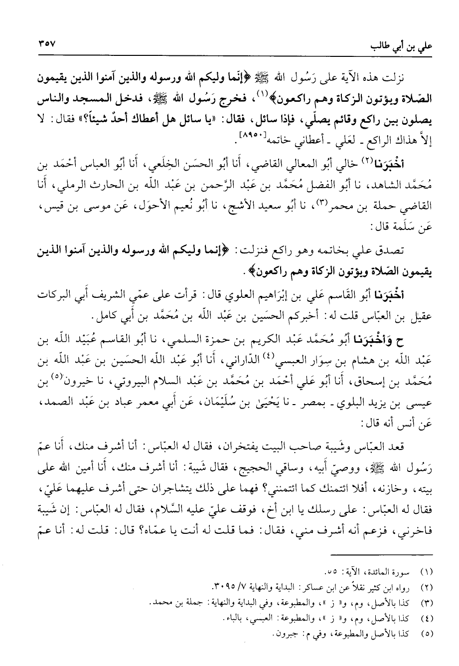 نزلت هذه الاية على رسول الله صلى الله عليه وسلم " إنما وليكم الله ورسوله والذين أمنوا الذين يقيمون الصلاة ويؤتون الزكاة وهم راكعون " (1) فخرج رسول الله (صلى الله عليه وسلم) المسجد والناس يصلون بين راكع وقائم يصلي فإذا سائل فقال يا سائل هل أعطاك أحدا شيئا فقال لا إلا هذاك الراكع لعلي أعطاني خاتمه أخبرنا (2) خالي أبو المعالي القاضي أنا أبو الحسن الخلعي أنا أبو العباس أحمد بن محمد الشاهد نا أبو الفضل محمد بن عبد الرحمن بن عبد الله بن الحارث الرملي أنا القاضي حملة بن محمر (3) نا أبو سعيد الأشج نا أبو نعيم الأحول عن موسى بن قيس عن سلمة قال تصدق علي بخاتمه وهو راكع فنزلت " إنما وليكم الله ورسوله والذين امنوا الذين يقيمون الصلاة ويؤتون الزكاة وهم راكعون " أخبرنا أبو القاسم علي بن إبراهيم العلوي قال قرأت على عمي الشريف أبي البركات عقيل بن العباس قلت له أخبركم الحسين بن عبد الله بن محمد بن أبي كامل ح وأخبرنا أبو محمد عبد الكريم بن حمزة السلمي نا أبو القاسم عبيد الله بن عبد الله بن هشام بن سوار العبسي (4) الداراني أنا أبو عبد الله الحسين بن عبد الله بن محمد بن إسحاق أنا أبو علي أحمد بن محمد بن عبد السلام البيروتي نا خيرون (5) بن عيسى بن يزيد البلوي بمصر نا يحيى بن سليمان عن أبي معمر عباد بن عبد الصمد عن أنس أنه قال قعد العباس وشيبة صاحب البيت يفتخران فقال له العباس أنا أشرف منك أنا عم رسول الله (صلى الله عليه وسلم) ووصي أبيه وساقي الحجيج فقال شيبة أنا أشرف منك أنا أمين الله على بيته وخازنه أفلا أئتمنك كما ائتمنني فهما على ذلك يتشاجران حتى أشرف عليهما علي فقال له العباس على رسلك يا ابن أخ فوقف علي عليه السلام فقال له العباس إن شيبة فاخرني فزعم أنه أشرف مني فقال فما قلت له أنت يا عماه قال قلت له أنا عم