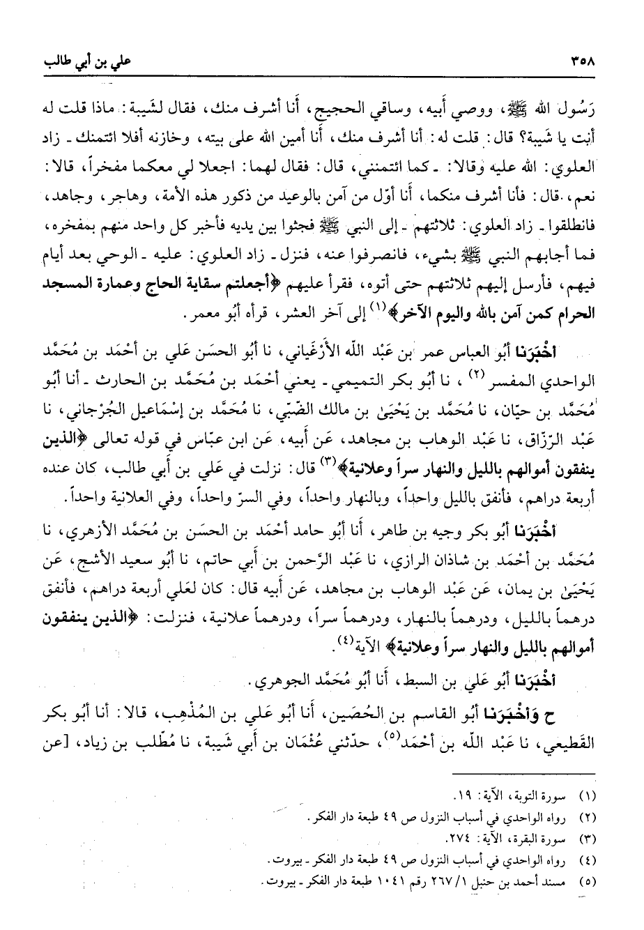 رسول الله (صلى الله عليه وسلم) ووصي أبيه وساقي الحجيج أنا أشرف منك فقال لشيبة ماذا قلت له أنت يا شيبة قال قلت له أنا أشرف منك أنا أمين الله على بيته وخازنه إفلا ائتمنك زاد العلوي الله عليه وقالا كما ائتمنني قال فقال لهما اجعلا لي معكما مفخرا قالا نعم قال فأنا أشرف منكما أنا أول من امن بالوعيد من ذكور هذه الأمة وهاجر وجاهد فانطلقوا زاد العلوي ثلاثتهم إلى النبي (صلى الله عليه وسلم) فجثوا بين يديه فأخبر كل واحد منهم بمفخره فما أجابهم النبي (صلى الله عليه وسلم) بشئ فانصرفوا عنه فنزل زاد العلوي عليه الوحي بعد أيام فيهم فأرسل إليهم ثلاثتهم حتى أتوه فقرأ عليهم " أجعلتم سقاية الحاج وعمارة المسجد الحرام كمن امن بالله واليوم الاخر " (1) إلى اخر العشر قرأه أبو معمر أخبرنا أبو العباس عمر بن عبد الله الأرغياني نا أبو الحسن علي بن أحمد بن محمد الواحدي المفسر (2) نا أبو بكر التميمي يعني أحمد بن محمد بن الحارث أنا أبو محمد بن حيان نا محمد بن يحيى بن مالك الضبي نا محمد بن أسماعيل الجرجاني نا عبد الرزاق نا عبد الوهاب بن مجاهد عن أبيه عن ابن عباس في قوله تعالى " الذين ينفقون أموالهم بالليل والنهار سرا وعلانية " (3) قال نزلت في علي بن أبي طالب كان عنده أربعة دراهم فأنفق بالليل واحدا وبالنهار واحدا وفي السر واحدا وفي العلانية واحدا أخبرنا أبو بكر وجيه بن طاهر أنا أبو حامد أحمد بن الحسن بن محمد الأزهري نا محمد بن أحمد بن شاذان الرازي نا عبد الرحمن بن أبي حاتم نا أبو سعيد الأشج عن يحيى بن يمان عن عبد الوهاب بن مجاهد عن أبيه قال كان لعلي أربعة دراهم فأنفق درهما بالليل ودرهما بالنهار ودرهما سرا ودرهما علانية فنزلت " الذين ينفقون أموالهم بالليل والنهار سرا وعلانية " الاية (4) أخبرنا أبو علي بن السبط أنا أبو محمد الجوهري ح وأخبرنا أبو القاسم بن الحصين أنا أبو علي بن المذهب قالا أنا أبو بكر القطيعي نا عبد الله بن أحمد (5) حدثني عثمان بن أبي شيبة نا مطلب بن زياد عن