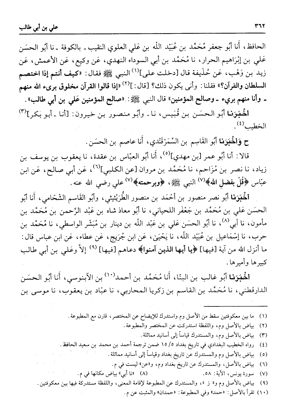 الحافظ أنا أبو جعفر محمد بن عبيد الله بن علي العلوي النقيب بالكوفة نا أبو الحسن علي بن إبراهيم الحرار نا محمد بن أبي السوداء النهدي عن وكيع عن الأعمش عن زيد بن وهب عن حذيفة قال دخلت على (1) النبي (صلى الله عليه وسلم) فقال كيف أنتم إذا اختصم السلطان والقران فقلنا وأنى يكون ذلك قال (2) إذا قالوا القران مخلوق برئ الله منهم وأنا منهم برئ وصالح المؤمنين قال النبي (صلى الله عليه وسلم) صالح المؤمنين علي بن أبي طالب أخبرنا أبو الحسن بن قبيس نا وأبو منصور بن خيرون أنا أبو بكر (3) الخطيب (4) ح وأخبرنا أبو القاسم بن السمرقندي أنا عاصم بن الحسن قالا أنا أبو عمر بن مهدي (5) أنا أبو العباس بن عقدة نا يعقوب بن يوسف بن زياد نا نصر بن مزاحم نا محمد بن مروان عن الكلبي (6) عن أبي صالح عن ابن عباس " قل بفضل الله " النبي (صلى الله عليه وسلم) وبرحمته (7) على Bهـ أخبرنا أبو نصر منصور بن أحمد بن منصور الطريثيثي وأبو القاسم الشحامي أنا أبو الحسن علي بن محمد بن جعفر اللحياني نا أبو معاذ شاه بن عبد الرحمن بن محمد بن مأمون نا أبي (8) نا أبو الحسن علي بن عبد الله بن دينار بن مبشر الواسطي نا محمد بن حرب نا إسماعيل بن عبيد الله نا يحيى عن ابن جريج عن عطاء عن ابن عباس قال ما أنزل الله من اية فيها " يا أيها الذين آمنوا " دعاهم فيها (9) إلا وعلي بن أبي طالب كبيرها وأميرها أخبرنا أبو غالب بن البنا أنا محمد بن أحمد (10) بن الابنوسي أنا أبو الحسن الدارقطني نا محمد بن القاسم بن زكريا المحاربي نا عباد بن يعقوب نا موسى بن