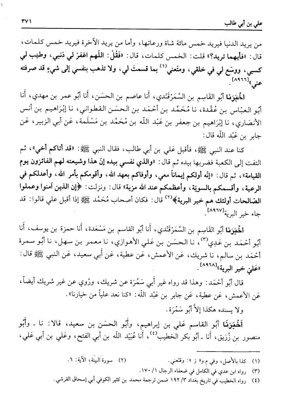 من يريد الدنيا فيريد خمس مائة شاة ورعاتها وأما من يريد الاخرة فيريد خمس كلمات قال فأيهما تريد قلت الخمس كلمات قال فقل اللهم اغفر لي ذنبي وطيب لي كسبي ووسع لي في خلقي ومتعني (1) بما قسمت لي ولا تذهب بنفسي إلى شئ قد صرفته عني أخبرنا أبو القاسم بن السمرقندي أنا عاصم بن الحسن أنا أبو عمر بن مهدي أنا أبو العباس بن عقدة نا محمد بن أحمد بن الحسن القطواني نا إبراهيم بن أنس الأنصاري نا إبراهيم بن جعفر بن عبد الله بن محمد بن مسلمة عن أبي الزبير عن جابر بن عبد الله قال كنا عند النبي (صلى الله عليه وسلم) فأقبل علي بن أبي طالب فقال النبي (صلى الله عليه وسلم) قد أتاكم أخي ثم التفت إلى الكعبة فضربها بيده ثم قال والذي نفسي بيده إن هذا وشيعته لهم الفائزون يوم القيامة ثم قال إنه أولكم إيمانا معي وأوفاكم بعهد الله وأقومكم بأمر الله وأعدلكم في الرعية وأقسمكم بالسوية وأعظمكم عند الله مزية قال ونزلت " إن الذين امنوا وعملوا الصالحات أولئك هم خير البرية " (2) قال فكان أصحاب محمد (صلى الله عليه وسلم) إذا أقبل على قالوا قد جاء خير البرية اخبرنا أبو القاسم بن السمرقندي أنا أبو القاسم بن مسعدة أنا حمزة بن يوسف أنا أبو أحمد بن عدي (3) نا الحسن بن علي الأهوازي نا معمر بن سهل نا أبو سمرة أحمد بن سالم نا شريك عن الأعمش عن عطية عن أبي سعيد عن النبي (صلى الله عليه وسلم) قال علي خير البرية قال أبو أحمد وهذا قد رواه غير أبي سمرة عن شريك وروي عن غير شريك أيضا عن الأعمش عن عطية عن جابر بن عبد الله كنا نعد عليا من خيارنا ولا يسنده هكذا إلا أبو سمرة أخبرنا أبو القاسم علي بن إبراهيم وأبو الحسن بن سعيد قالا نا وأبو منصور بن زريق أنا أبو بكر الخطيب (4) أنا عبيد الله بن أبي الفتح وعلي بن أبي على