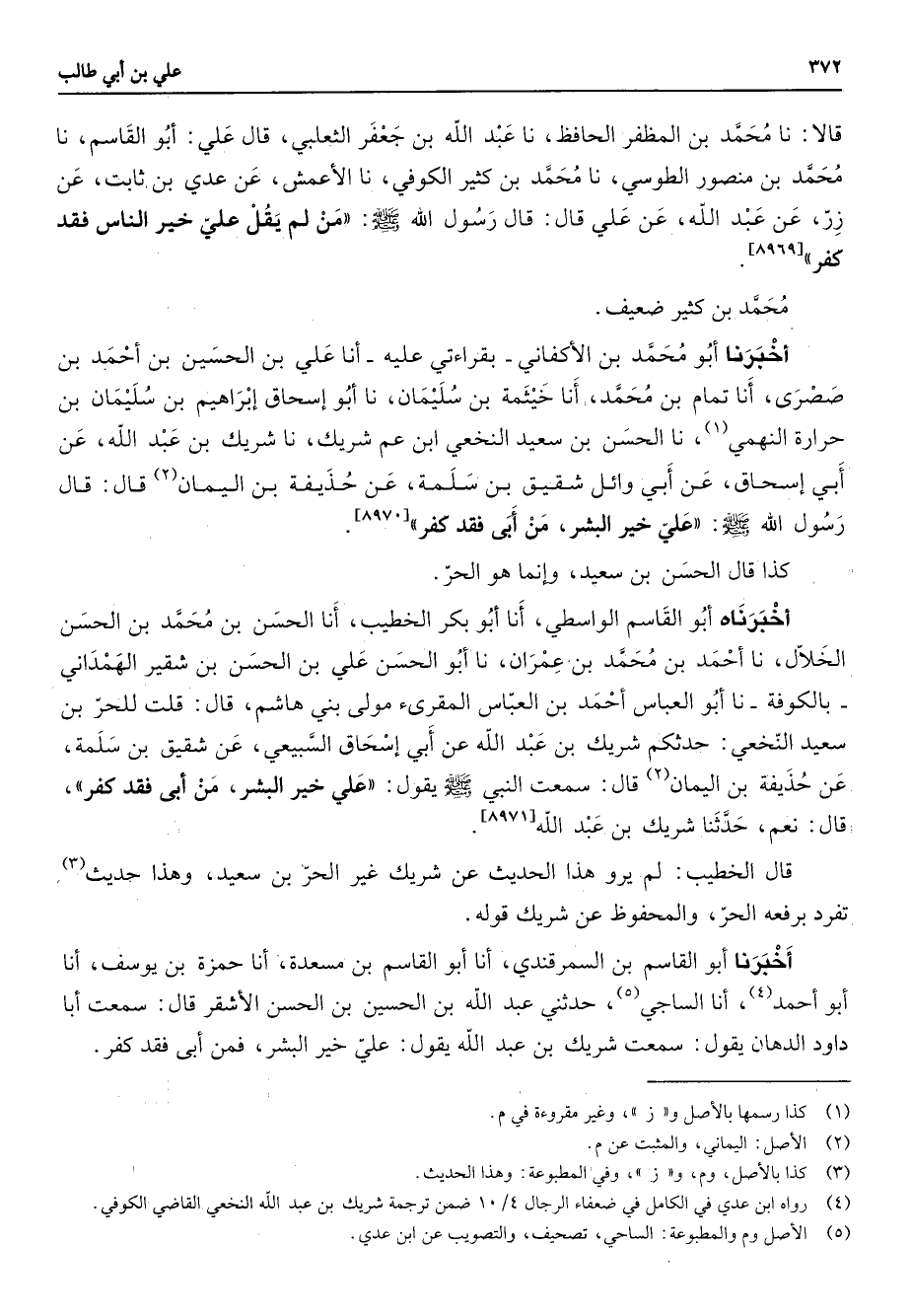 قالا نا محمد بن المظفر الحافظ نا عبد الله بن جعفر الثعلبي قال علي أبوالقا نا محمد بن منصور الطوسي نا محمد بن كثير الكوفي نا الأعمش عن عدي بن ثابت عن زر عن عبد الله عن علي قال قال رسول الله (صلى الله عليه وسلم) من لم يقل علي خير الناس فقد كفر محمد بن كثير ضعيف أخبرنا أبو محمد بن الأكفاني بقراءتي عليه أنا علي بن الحسين بن أحمد بن صصرى أنا تمام بن محمد أنا خيثمة بن سليمان نا أبو إسحاق إبراهيم بن سليمان بن حرارة النهمي (1) نا الحسن بن سعيد النخعي ابن عم شريك نا شريك بن عبد الله عن أبي إسحاق عن أبي وائل شقيق بن سلمة عن حذيفة بن اليمان (2) قال قال رسول الله (صلى الله عليه وسلم) علي خير البشر من أبى فقد كفر كذا قال الحسن بن سعيد وإنما هو الحر أخبرناه أبو القاسم الواسطي أنا أبو بكر الخطيب أنا الحسن بن محمد بن الحسن الخلال نا أحمد بن محمد بن عمران نا أبو الحسن علي بن الحسن بن شقير الهمداني بالكوفة نا أبو العباس أحمد بن العباس المقرئ مولى بني هاشم قال قلت للحر بن سعيد النخعي حدثكم شريك بن عبد الله عن أبي إسحاق السبيعي عن شقيق بن سلمة عن حذيفة بن اليمان (2) قال سمعت النبي (صلى الله عليه وسلم) يقول علي خير البشر من أبى فقد كفر قال نعم حدثنا شريك بن عبد الله قال الخطيب لم يرو هذا الحديث عن شريك غير الحر بن سعيد وهذا حديث (3) تفرد برفعه الحر والمحفوظ عن شريك قوله أخبرنا أبو القاسم بن السمرقندي أنا أبو القاسم بن مسعدة أنا حمزة بن يوسف أنا أبو أحمد (4) أنا الساجي (5) حدثني عبد الله بن الحسين بن الحسن الأشقر قال سمعت أبا داود الدهان يقول سمعت شريك بن عبد الله يقول علي خير البشر فمن أبى فقد كفر