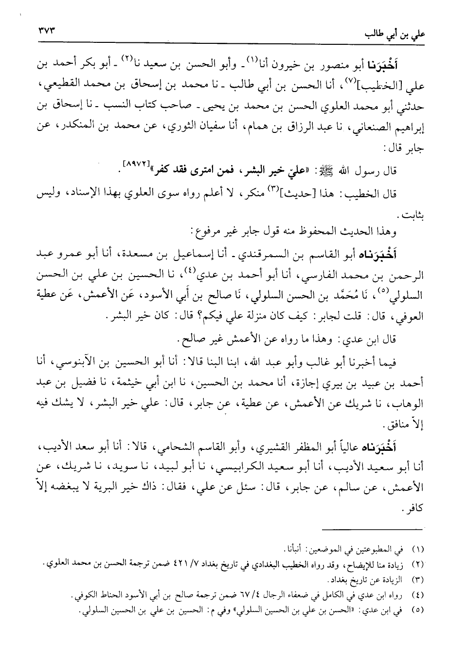 أخبرنا أبو منصور بن خيرون أنا (1) وأبو الحسن بن سعيد نا (2) أبو بكر أحمد بن علي الخطيب (7) أنا الحسن بن أبي طالب نا محمد بن إسحاق بن محمد القطيعي حدثني أبو محمد العلوي الحسن بن محمد بن يحيى صاحب كتاب النسب نا إسحاق بن إبراهيم الصنعاني نا عبد الرزاق بن همام أنا سفيان الثوري عن محمد بن المنكدر عن جابر قال قال رسول الله (صلى الله عليه وسلم) علي خير البشر فمن امترى فقد كفر قال الخطيب هذا حديث (3) منكر لا أعلم رواه سوى العلوي بهذا الإسناد وليس بثابت وهذا الحديث المحفوظ منه قول جابر غير مرفوع أخبرناه أبو القاسم بن السمرقندي أنا إسماعيل بن مسعدة أنا أبو عمرو عبد الرحمن بن محمد الفارسي أنا أبو أحمد بن عدي (4) نا الحسين بن علي بن الحسن السلولي (5) نا محمد بن الحسن السلولي نا صالح بن أبي الأسود عن الأعمش عن عطية العوفي قال قلت لجابر كيف كان منزلة علي فيكم قال كان خير البشر قال ابن عدي وهذا ما رواه عن الأعمش غير صالح فيما أخبرنا أبو غالب وأبو عبد الله ابنا البنا قالا أنا أبو الحسين بن الابنوسي أنا أحمد بن عبيد بن بيري إجازة أنا محمد بن الحسين نا ابن أبي خيثمة نا فضيل بن عبد الوهاب نا شريك عن الأعمش عن عطية عن جابر قال علي خير البشر لا يشك فيه إلا منافق أخبرناه عاليا أبو المظفر القشيري وأبو القاسم الشحامي قالا أنا أبو سعد الأديب أنا أبو سعيد الأديب أنا أبو سيعد الكرابيسي نا أبو لبيد نا سويد نا شريك عن الأعمش عن سالم عن جابر قال سئل عن علي فقال ذاك خير البرية لا يبغضه إلا كافر