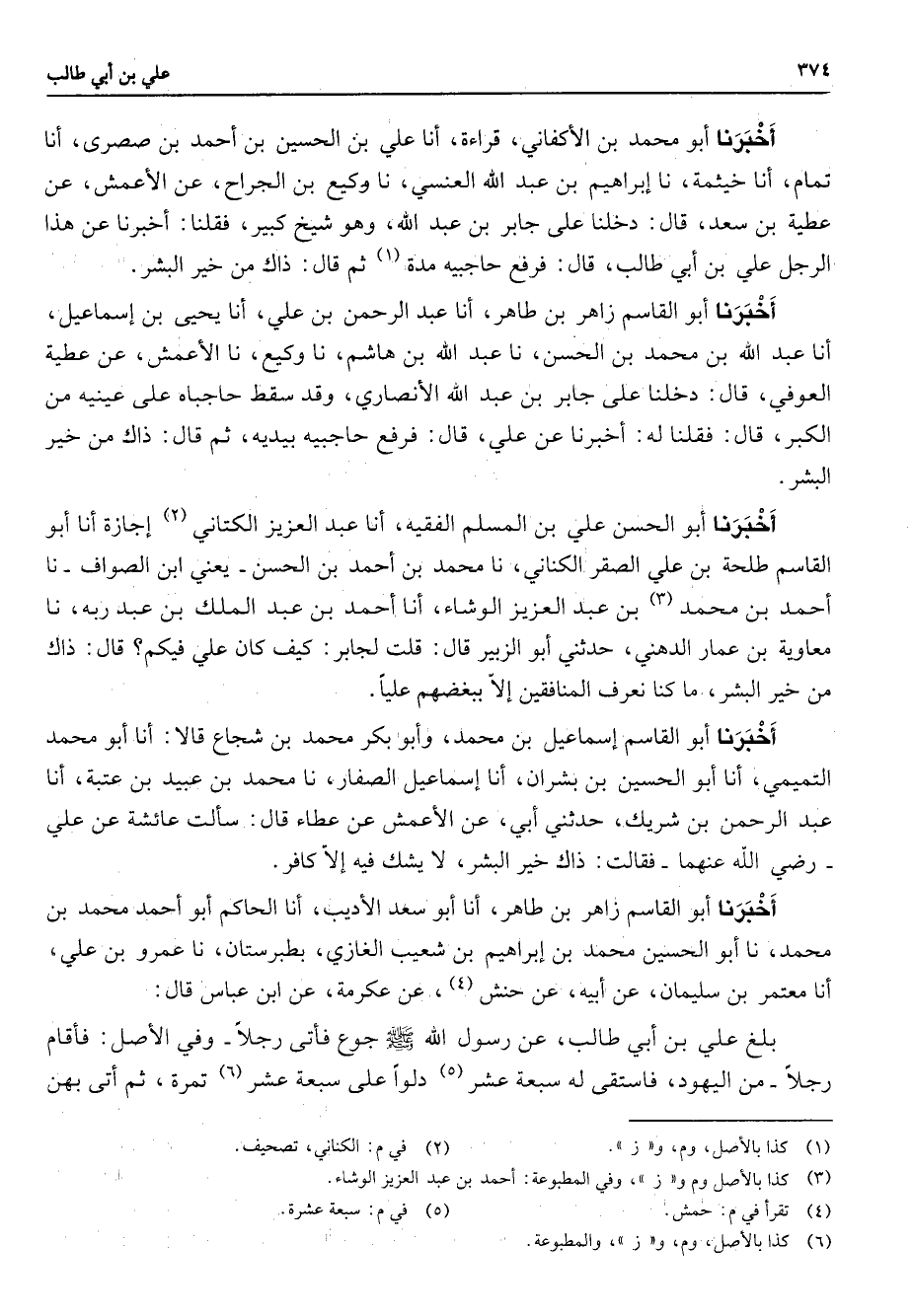 أخبرنا أبو محمد بن الأكفاني قراءة أنا علي بن الحسين بن أحمد بن صصرى أنا تمام أنا خيثمة نا إبراهيم بن عبد الله العنسي نا وكيع بن الجراح عن الأعمش عن عطية بن سعد قال دخلنا على جابر بن عبد الله وهو شيخ كبير فقلنا أخبرنا عن هذا الرجل علي بن أبي طالب قال فرفع حاجبيه مدة (1) ثم قال ذاك من خير البشر أخبرنا أبو القاسم زاهر بن طاهر أنا عبد الرحمن بن علي أنا يحيى بن إسماعيل أنا عبد الله بن محمد بن الحسن نا عبد الله بن هاشم ناوكيع نا الأعمش عن عطية العوفي قال دخلنا على جابر بن عبد الله الأنصاري وقد سقط حاجباه على عينيه من الكبر قال فقلنا له أخبرنا عن علي قال فرفع حاجبيه بيديه ثم قال ذاك من خير البشر أخبرنا أبو الحسن علي بن المسلم الفقيه أنا عبد العزيز الكتاني (2) إجازة أنا أبو القاسم طلحة بن علي الصقر الكناني نا محمد بن أحمد بن الحسن يعني ابن الصواف نا احمد بن محمد (3) بن عبد العزيز الوشاء أنا أحمد بن عبد الملك بن عبد ربه نا معاوية بن عمار الدهني حدثني أبو الزبير قال قلت لجابر كيف كان علي فيكم قال ذاك من خير البشر ما كنا نعرف المنافقين إلا ببغضهم عليا أخبرنا أبو القاسم إسماعيل بن محمد وأبو بكر محمد بن شجاع قالا أنا أبو محمد التميمي أنا أبو الحسين بن بشران أنا إسماعيل الصفار نا محمد بن عبيد بن عتبة أنا عبد الرحمن بن شريك حدثني أبي عن الأعمش عن عطاء قال سألت عائشة عن علي Bهما فقالت ذاك خير البشر لا يشك فيه إلا كافر أخبرنا أبو القاسم زاهر بن طاهر أنا أبو سعد الأديب أنا الحاكم أبو أحمد محمد بن محمد نا أبو الحسين محمد بن إبراهيم بن شعيب الغازي بطبرستان نا عمرو بن علي أنا معتمر بن سليمان عن أبيه عن حنش (4) عن عكرمة عن ابن عباس قال بلغ علي بن أبي طالب عن رسول الله (صلى الله عليه وسلم) جوع فأتى رجلا وفي الأصل فأقام رجلا من اليهود فاستقى لسبعة عشر (5) دلوا على سبعة عشر (6) تمرة ثم أتى بهن