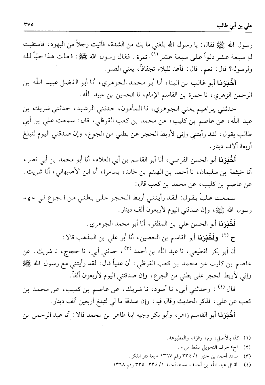 رسول الله (صلى الله عليه وسلم) فقال يارسول الله بلغني ما بك من الشدة فأتيت رجلا من اليهود فاستقيت ل سبعة عشر دلوا على سبعة عشر (1) تمرة فقال رسول الله (صلى الله عليه وسلم) فعلت هذا حبا لله ولرسوله قال نعم قال فأعد للبلاء تجفافا يعني الصبر أخبرنا أبو غالب بن البنا أنا أبو محمد الجوهري أنا أبو الفضل عبيد الله بن الرحمن الزهري نا حمزة بن القاسم الإمام نا الحسين بن عبيد الله حدثني إبراهيم يعني الجوهري نا المأمون حدثني الرشيد حدثني شريك بن عبد الله عن عاصم بن كليب عن محمد بن كعب القرظي قال سمعت علي بن أبي طالب يقول لقد رأيتني وإني لأربط الحجر عن بطني من الجوع وإن صدقتي اليوم لتبلغ أربعة ألاف دينار أخبرنا أبو الحسن الفرضي أنا أبو القاسم بن أبي العلاء أنا أبو محمد بن أبي نصر أنا خيثمة بن سليمان نا أحمد بن الهيثم بن خالد بسامرا أنا ابن الأصبهاني أنا شريك عن عاصم بن كليب عن محمد بن كعب قال سمعت عليا يقول لقد رأيتني أربط الحجر على بطني من الجوع في عهد رسول الله (صلى الله عليه وسلم) وإن صدقني اليوم لأربعون ألف دينار أخبرنا أبو الحسن علي بن المظفر أنا أبو محمد الجوهري ح (2) وأخبرنا أبو القاسم بن الحصين أنا أبو علي بن المذهب قالا أنا أبو بكر القطيعي نا عبد الله بن أحمد (3) حدثني أبي نا حجاج نا شريك عن عاصم بن كليب عن محمد بن كعب القرظي أن عليا قال لقد رأيتني مع رسول الله (صلى الله عليه وسلم) وإني لأربط الحجر على بطني من الجوع وإن صدقتني اليوم لأربعون ألفا قال (4) وحدثني أبي نا أسود نا شريك عن عاصم بن كليب عن محمد بن كعب عن علي فذكر الحديث وقال فيه وإن صدقة ما لي لتبلغ أربعين ألف دينار أخبرنا أبو القاسم زاهر وأبو بكر وجيه ابنا طاهر بن محمد قالا أنا عبد الرحمن بن