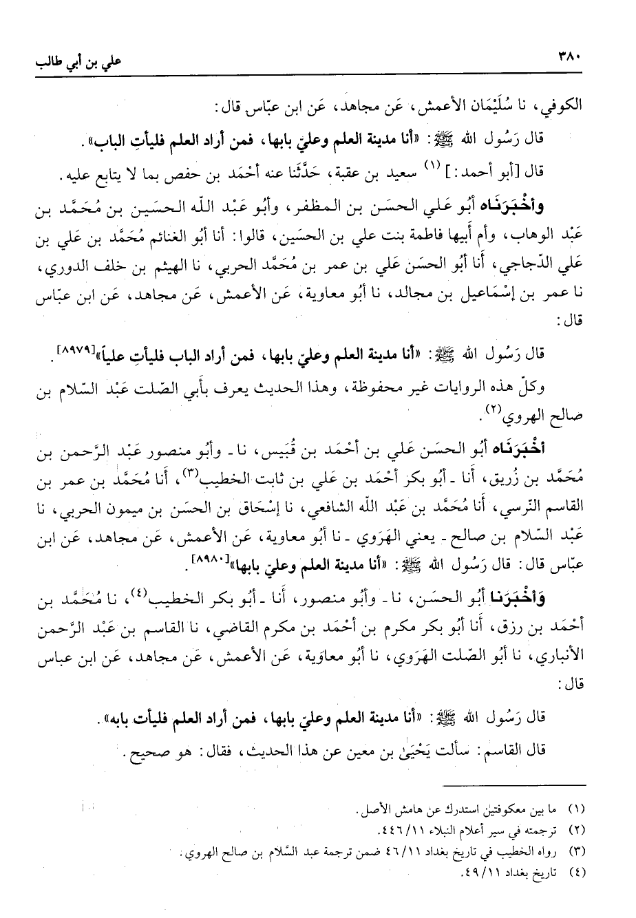 الكوفي نا سليمان الأعمش عن مجاهد عن ابن عباس قال قال رسول الله (صلى الله عليه وسلم) أنا مدينة العلم وعلي بابها فمن أراد العلم فليأت الباب قال أبو أحمد (1) سعيد بن عقبة حدثنا عنه أحمد بن حفص بما لا يتابع عليه وأخبرناه أبو علي الحسن بن المظفر وأبو عبد الله الحسين بن محمد بن عبد الوهاب وأم أبيها فاطمة بنت علي بن الحسين قالوا أنا أبو الغنائم محمد بن علي بن علي الدجاجي أنا أبو الحسن علي بن عمر بن محمد الحربي نا الهيثم بن خلف الدوري نا عمر بن إسماعيل بن مجالد نا أبو معاوية عن الأعمش عن مجاهد عن ابن عباس قال قال رسول الله (صلى الله عليه وسلم) أنا مدينة العلم وعلي بابها فمن أراد الباب فليات عليا وكل هذه الروايات غير محفوظة وهذا الحديث يعرف بأبي الصلت عبد السلام بن صالح الهروي (2) أخبرناه أبو الحسن علي بن أحمد بن قبيس نا وأبو منصور عبد الرحمن بن محمد بن زريق أنا أبو بكر أحمد بن علي بن ثابت الخطيب (3) أنا محمد بن عمر بن القاسم النرسي أنا الحسن بن ميمون الحربي عبد السلام بن صالح محمد بن عبد الله الشافعي نا إسحاق بن يعني الهروي نا أبو معاوية عن الأعمش عن مجاهد عن ابن عباس قال قال رسول الله (صلى الله عليه وسلم) أنا مدينة العلم وعلي بابها وأخبرنا أبو الحسن نا وأبو منصور أنا أبو بكر الخطيب (4) نا محمد بن أحمد بن رزق أنا أبو بكر مكرم بن أحمد بن مكرم القاضي نا القاسم بن عبد الرحمن الأنباري نا أبو الصلت الهروي نا أبو معاوية عن الأعمش عن مجاهد عن ابن عباس قال قال رسول الله صلى الله عليه وسلم) أنا مدينة العلم وعلي بابها فمن أراد العلم فليأت بابه قال القاسم سألت يحيى بن معين عن هذا الحديث فقال هو صحيح