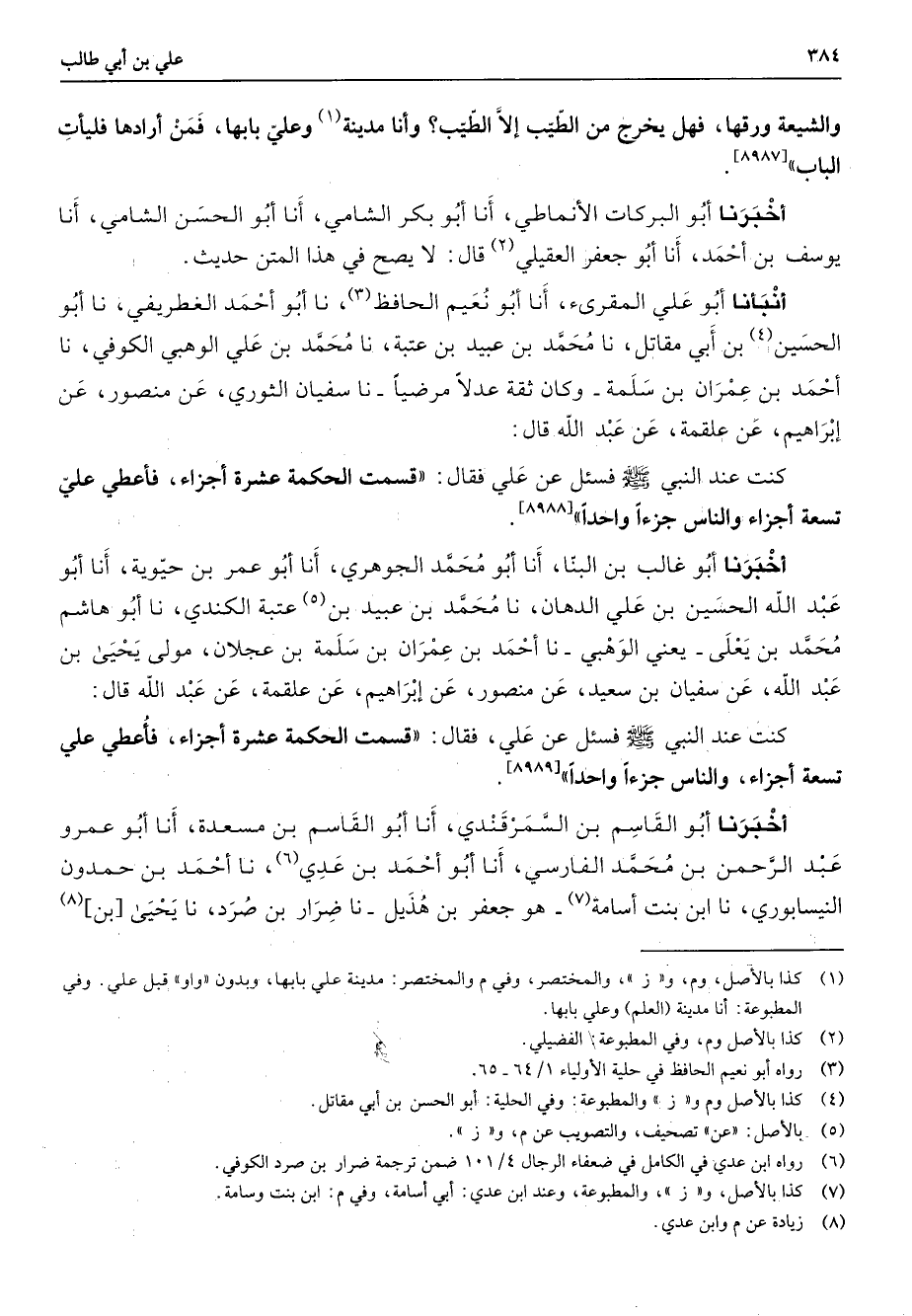 والشيعة ورقها فهل يخرج من الطيب إلا الطيب وأنا مدينة (1) وعلي بابها فمن أرادها فليأت الباب أخبرنا أبو البركات الأنماطي أنا أبو بكر الشامي أنا أبو الحسن الشامي أنا يوسف بن أحمد أنا أبو جعفر العقيلي (2) قال لا يصح في هذا المتن حديث أنبانا أبو علي المقرئ أنا أبو نعيم الحافظ (3) نا أبو أحمد الغطريفي نا أبو الحسين (4) بن أبي مقاتل نا محمد بن عبيد بن عتبة نا محمد بن علي الوهبي الكوفي نا أحمد بن عمران بن سلمة وكان ثقة عدلا مرضيا نا سفيان الثوري عن منصور عن إبراهيم عن علقمة عن عبد الله قال كنت عند النبي (صلى الله عليه وسلم) فسئل عن علي قال قسمت الحكمة عشرة أجزاء فأعطي علي تسعة أجزاء والناس جزءا واحدا أخبرنا أبو غالب بن البنا أنا أبو محمد الجوهري أنا أبو عمر بن حيوية أنا أبو عبد الله الحسين بن علي الدهان نا محمد بن عبيد بن عتبة الكندي (5) نا أبو هاشم محمد بن يعلى يعني الوهبي نا أحمد بن عمران بن سلمة بن عجلان مولى يحيى بن عبد الله عن سفيان بن سعيد عن منصور عن إبراهيم عن علقمة عن عبد الله قال كنت عند النبي (صلى الله عليه وسلم) فسئل عن علي فقال قسمت الحكمة عشرة أجزاء فأعطي علي تسعة أجزاء والناس جزءا واحدا أخبرنا أبو القاسم بن السمرقندي أنا أبو القاسم بن مسعدة أنا أبو عمرو عبد الرحمن بن محمد الفارسي أنا أبو أحمد بن عدي (6) نا أحمد بن حمدون النيسابوري نا ابن بنت أسامة (7) هو جعفر بن هذيل نا ضرار بن صرد نا يحيى بن (8)