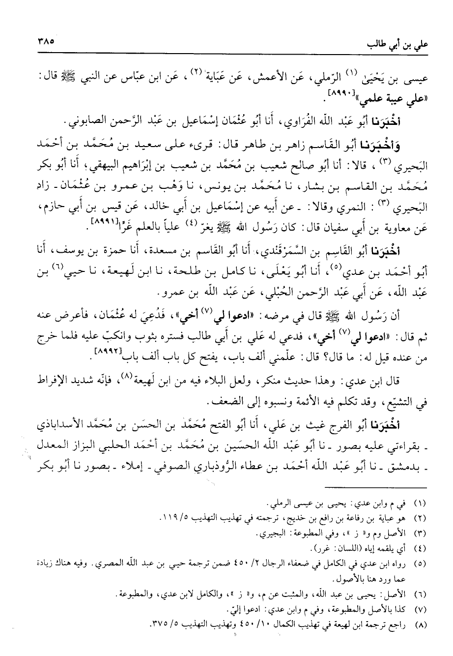 عيسى بن يحيى (1) الرملي عن الأعمش عن عباية (2) عن ابن عباس عن النبي (صلى الله عليه وسلم) قال علي عيبة علمي أخبرنا أبو عبد الله الفراوي أنا أبو عثمان إسماعيل بن عبد الرحمن الصابوني وأخبرنا أبو القاسم زاهر بن طاهر قال قرئ على سعيد بن محمد بن أحمد البحيري (3) قالا أنا أبو صالح شعيب بن محمد بن شعيب بن أبراهيم البيهقي أنا أبو بكر محمد بن القاسم بن بشار نا محمد بن يونس نا وهب بن عمرو بن عثمان زاد البحيري النمري وقالا عن أبيه عن إسماعيل بن أبي خالد عن قيس بن أبي حازم عن معاوية بن أبي سفيان قال كان رسول الله (صلى الله عليه وسلم) يغر (4) عليا بالعلم غرا أخبرنا أبو القاسم بن السمرقندي أنا أبو القاسم بن مسعدة أنا حمزة بن يوسف انا أبو أحمد بن عدي (5) أنا أبو يعلى ناكامل بن طلحة نا ابن لهيعة نا حيي (6) بن عبد الله عن أبي عبد الرحمن الحبلي عن عبد الله بن عمرو أن رسول الله (صلى الله عليه وسلم) قال في مرضه ادعوا لي (7) أخي فدعي له عثمان فأعرض عنه ثم قال أدعوا لي (7) أخي فدعي له علي بن أبي طالب فستره بثوب وانكب عليه فلما خرج من عنده قيل له ما قال قال علمني ألف باب يفتح كل باب ألف باب قال ابن عدي وهذا حديث منكول لعل البلاء فيه من ابن لهيعة (8) فإنه شديد الإفراط في التشيع وقد تكلم فيه الأئمة ونسبوه إلى ضعف أخبرنا أبو الفرج غيث بن علي أنا أبو الفتح محمد بن الحسن بن محمد الأسد اباذي بقراءتي عليه بصور نا أبو عبد الله الحسين بن محمد بن أحمد الحلبي البزاز المعدل بدمشق نا أبو عبد الله أحمد بن عطاء الروذباري الصوفي إملاء بصور نا أبو بكر