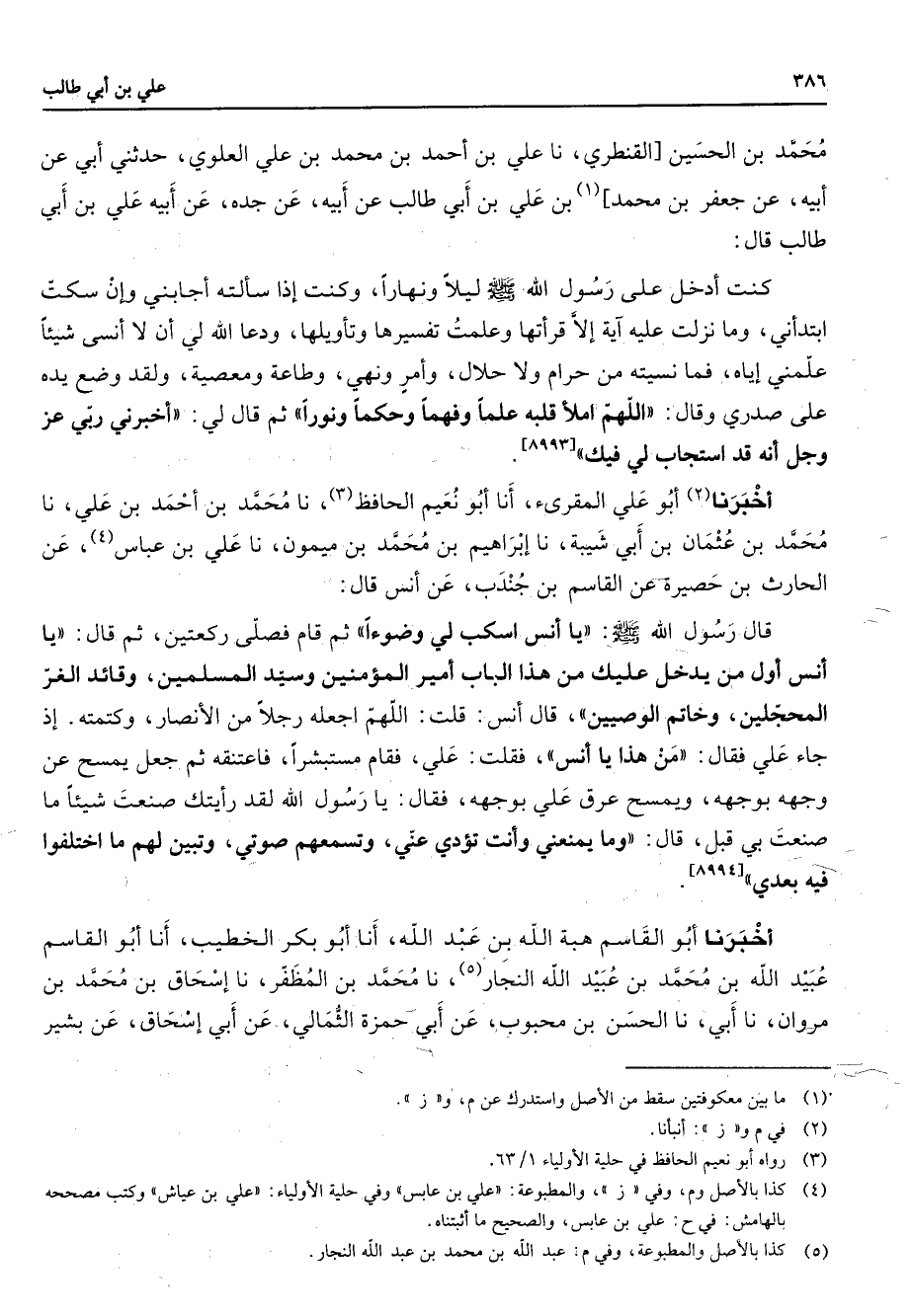 أحمد بن الحسين القنطري نا علي بن أحمد بن محمد بن علي العلوي حدثني أبي عن أبيه عن جعفر بن محمد بن علي بن أبي طالب عن أبيه عن جده عن أبيه علي بن أبي طالب قال كنت أدخل على رسول الله (صلى الله عليه وسلم) ليلا ونهارا وكنت إذا سألته أجابني وإن سكت ابتدأني وما نزلت عليه اية إلا قراتها وعلمت تفسيرها وتأويلها ودعا الله لي أن لا أنسى شيئا علمني إياه فما نسيته من حرام ولا حلال وأمر ونهي وطاعة ومعصية ولقد وضع يده على صدره وقال اللهم املا قلبه علما وفهما وحكما ونورا ثم قال لي أخبرني ربي عز وجل أنه قد استجاب لي فيك أخبرنا (2) أبو علي المقرئ أنا أبو نعيم الحافظ (3) نا محمد بن أحمد بن علي نا محمد بن عثمان بن ابي شيبة نا أبراهيم بن محمد بن ميمون نا علي بن عباس (4) عن الحارث بن حصيرة عن القاسم بن جندب عن أنس قال قال رسول الله (صلى الله عليه وسلم) يا أنس اسكب لي وضوءا ثم قام فصلى ركعتين ثم قال يا أنس أول من يدخل عليك من هذا الباب أمير المؤمنين وسيد المسلمين وقائد الغر المحجلين وخاتم الوصيين قال أنس قلت اللهم أجعله رجلا من الأنصار وكتمته إذ جاء علي فقال من هذا يا أنس فقلت علي فقام مستبشرا فاعتنقه ثم جعل يمسح عن وجهه بوجهه ويسمح عرق علي بوجهه فقال يا رسول الله لقد رأيتك صنعت شيئا ما صنعت بي قبل قال وما يمنعني وأنت تؤدي عني وتسمعهم صوتي وتبين لهم ما اختلفوا فيه بعدي [* * * * أخبرنا أبو القاسم هبة الله بن عبد الله أنا أبو بكر الخطيب أنا أبو القاسم عبيد الله بن محمد بن عبيد الله النجار (5) نا محمد بن المظفر نا إسحاق بن محمد بن مروان نا أبي نا الحسن بن محبوب عن أبي حمزة الثمالي عن أبي إسحاق عن بشير