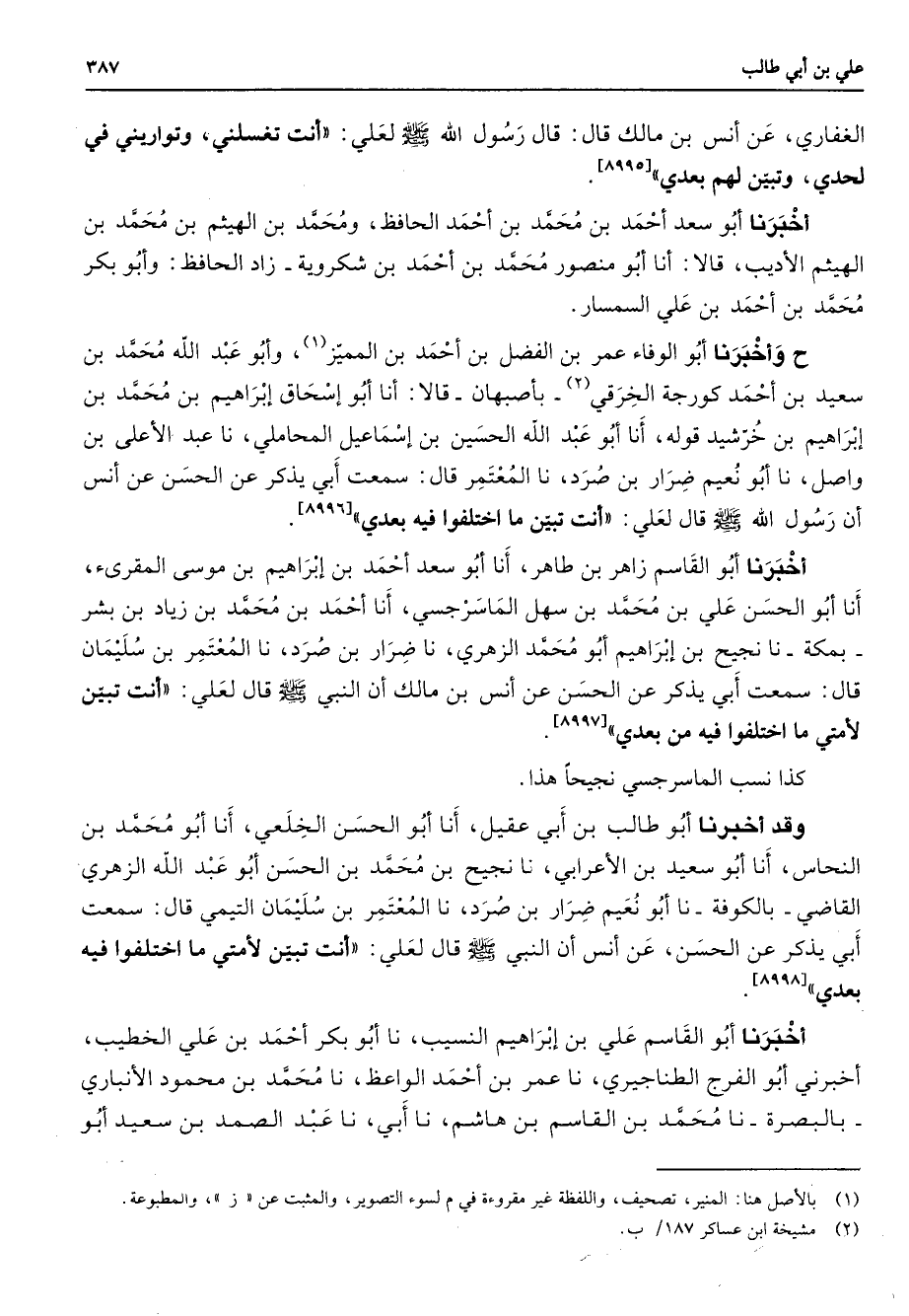 الغفاري عن أنس بن مالك قال قال رسول الله (صلى الله عليه وسلم) لعلي أنت تغسلني وتواريني في لحدي وتبين لهم بعدي أخبرنا أبو سعد أحمد بمحمد بن احمد الحافظ ومحمد بن الهيثم بن محمد بن الهيثم الأديب قالا أنا أبي منصور محمد بن أحمد بن شكرويه زاد الحافظ وأبو بكر محمد بن احمد بن علي السمسار ح وأخبرنا أبو الوفاء عمر بن الفضل بن أحمد بن المميز (1) وأبو عبد الله محمد بن سعيد بن أحمد كورجة الخرقي (2) بأصبهان قالا أنا أبو إسحاق إبراهيم بن محمد بن إبراهيم بن خرشيد قوله أنا أبو عبد الله الحسين بن إسماعيل المحاملي نا عبد الأعلى بن واصل نا أبو نعيم ضرار بن صرد نا المعتمر قال سمعت أبي يذكر عن الحسن عن أنس أن رسول الله (صلى الله عليه وسلم) قال لعلي انت تبين ما اختلفوا فيه بعدي أخبرنا أبو القاسم زاهر بن طاهر انا أبو سعد أحمد بن إبراهيم بن موسى المقرئ أنا أبو الحسن علي بن محمد بن سهل الماسرجسي أنا أحمد بن محمد بن زياد بن بشر بمكة نا نجيح بن إبراهيم أبو محمد الزهري نا ضرار بن صرد نا المعتمة بن سليمان قال سمعت أبي يذكر عن الحسن عن أنس بن مالك أن النبي (صلى الله عليه وسلم) قال لعلي أنت تبين لأمتي ما اختلفوا فيه من بعدي كذا نسب الماسرجسي نجيحا هذا وقد أخبرنا أبو طالب بن ابي عقيل أنا أبو الحسن الخلعي أنا أبو محمد بن النحاس أنا أبو سعيد بن الأعرابي نا نجيح بن محمد بن الحسن أبو عبد الله الزهري القاضي بالكوفة نا أبو نعيم ضرار بن صرد نا المعتمر بن سليمان التيمي قال سمعت أبي يذكر عن الحسن عن أنس أن النبي (صلى الله عليه وسلم) قال لعلي أنت تبين لأمتي ما اختلفوا فيه بعدي أخبرنا أبو القاسم علي بن إبراهيم النسيب نا أبو بكر أحمد بن علي الخطيب أخبرني أبو الفرج الطناجيري نا عمر بن أحمد الواعظ نا محمد بن محمود الأنباري بالبصرة نا محمد بن القاسم بن هاشم نا أبي نا عبد الصمد بن سعيد أبو