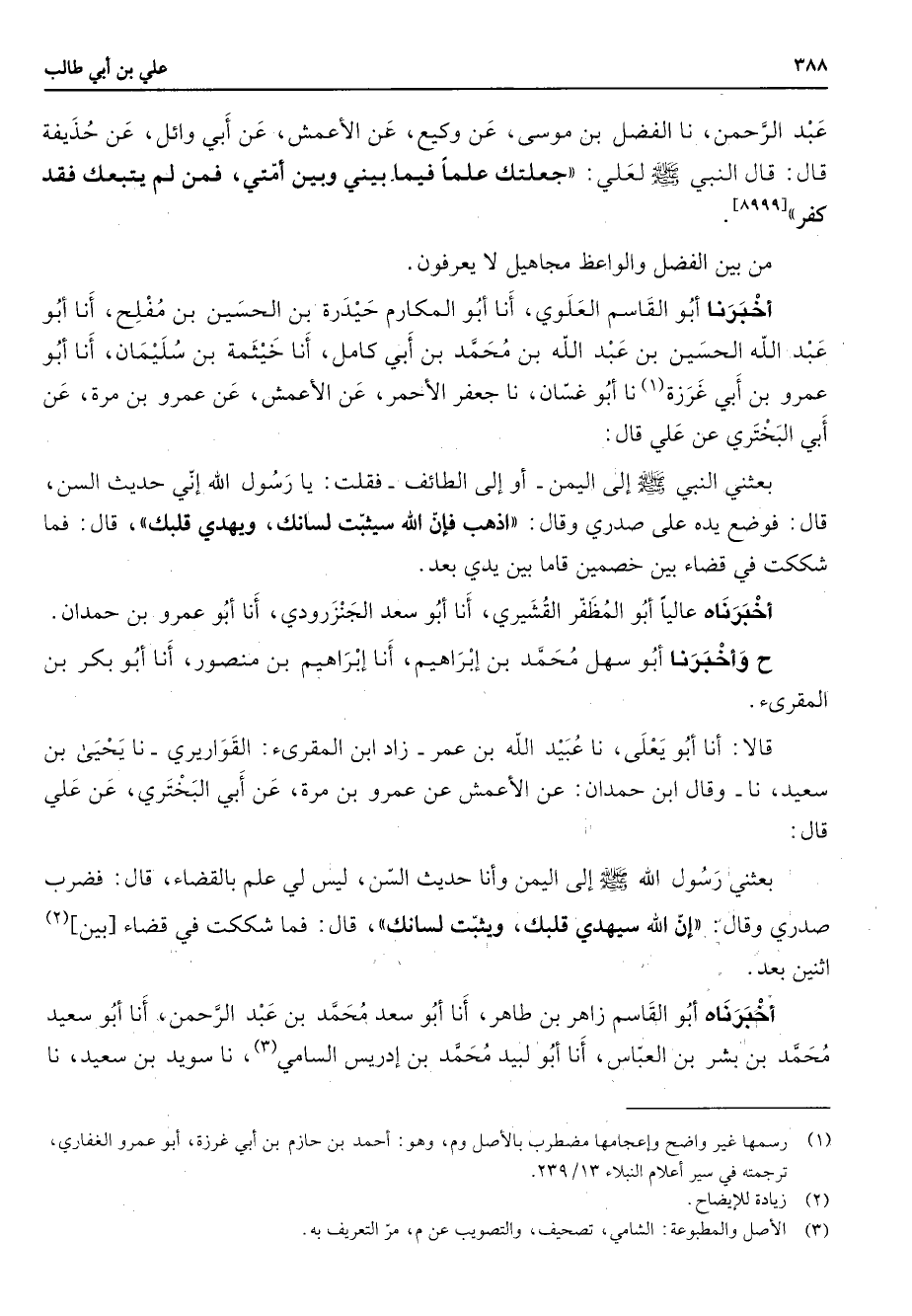 عبد الرحمن نا الفضل بن موسى عن وكيع عن الأعمش عن أبي وائل عن حذيفة قال قال النبي (صلى الله عليه وسلم) لعلي جعلتك علما فيما بيني وبين أمتي فمن لم يتبعك فقد كفر من بين الفضل والواعظ مجاهيل لا يعرفون أخبرنا أبو القاسم العلوي أنا أبو المكارم حيدرة بن الحسين بن مفلح أنا أبو عبد الله الحسين بن عبد الله بن محمد بن أبي كامل أنا خيثمة بن سليمان أنا أبو عمرو بن أبي غرزة (1) نا أبو غسان نا جعفر الأحمر عن الأعمش عن عمرو بن مرة عن أبي البختري عن علي قال بعثني النبي (صلى الله عليه وسلم) إلى اليمن أو إلى الطائف فقلت يا رسول الله إني حديث السن قال فوضع يده على صدري وقال أذهب فإن الله سيثبت لسانك ويهدي قلبك قال فما شككت في قضاء بين خصمين قاما بين يدي بعد أخبرناه عاليا أبو المظفر القشيري أنا أبو سعد الجنزرودي أنا أبو عمرو بن حمدان ح وأخبرنا أبو سهل محمد بن إبراهيم أنا إبراهيم بن منصور انا أبو بكر بن المقرئ قالا أنا أبو يعلى نا عبيد الله بن عمر زاد ابن المقرئ القواريري نا يحيى بن سعيد نا وقال ابن حمدان عن الأعمش عن عمرو بن مرة عن أبي البختري عن علي قال بعثني رسول الله (صلى الله عليه وسلم) إلى اليمن وأنا حديث السن ليس لي علم بالقضاء قال فضرب صدري وقال إن الله سيهدي قلبك ويثبت لسانك قال فما شككت في قضاء بين (2) اثنين بعد أخبرناه أبو القاسم زاهر بن طاهر أنا أبو سعد محمد بن عبد الرحمن أنا أبو سعيد محمد بن بشر بن العباس أنا أبو لبيد محمد بن إدريس السامي (3) نا سويد بن سعيد نا